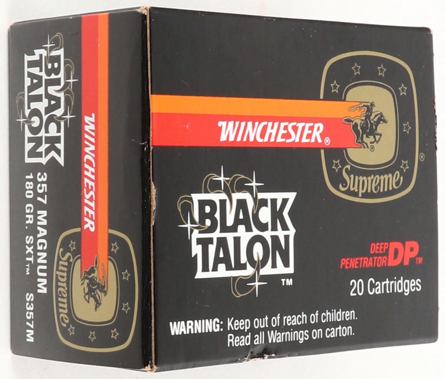 Winchester, Black Talon, .357 Magnum, 180 Gr. SXT, Full, 1pc. Black red & orange box, box is solid with excellent to minty color, minor shelf & corner wear, edges are crisp, end flaps are solid, ammo is minty. Grade: MINT - Value: 40 to 120