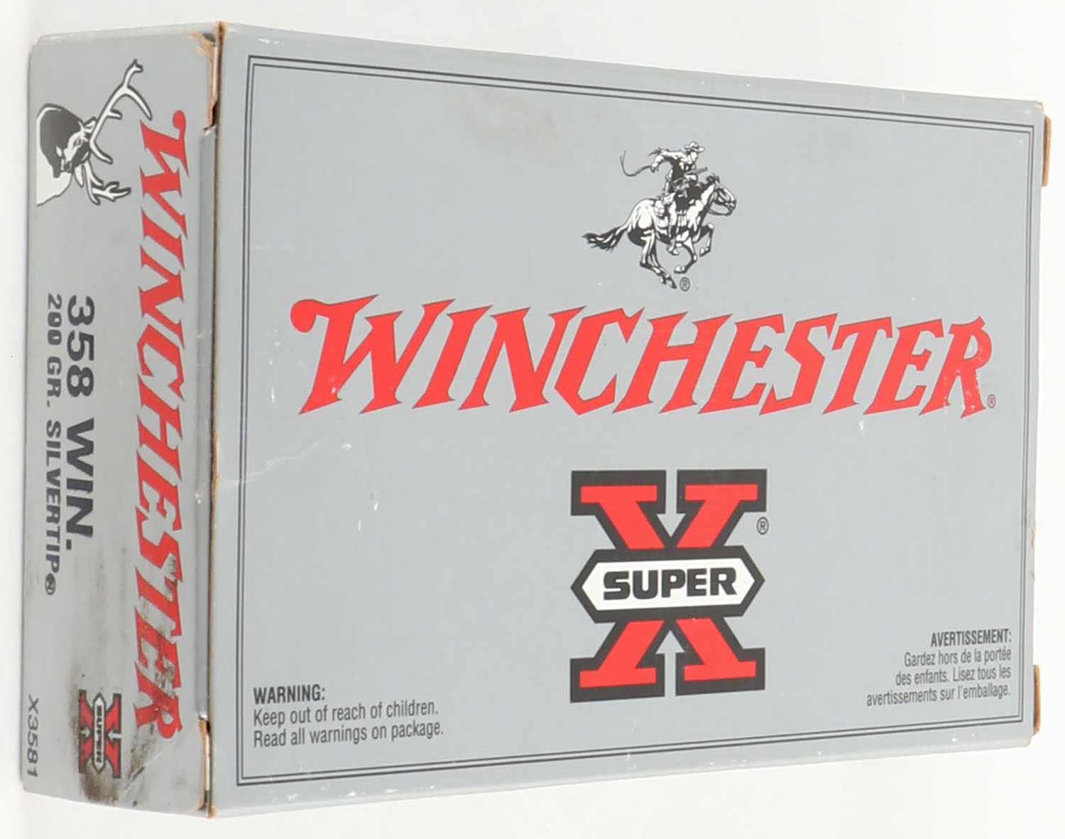 Winchester, Super X, .358 Winchester, 200 Grain Silvertip, Full, 1pc. Silver & red box, box is solid with minty color, very minor shelf & corner wear, edges are crisp, end flaps are solid, ammo is minty. Grade: Excellent ++ - Value: 20 to 60