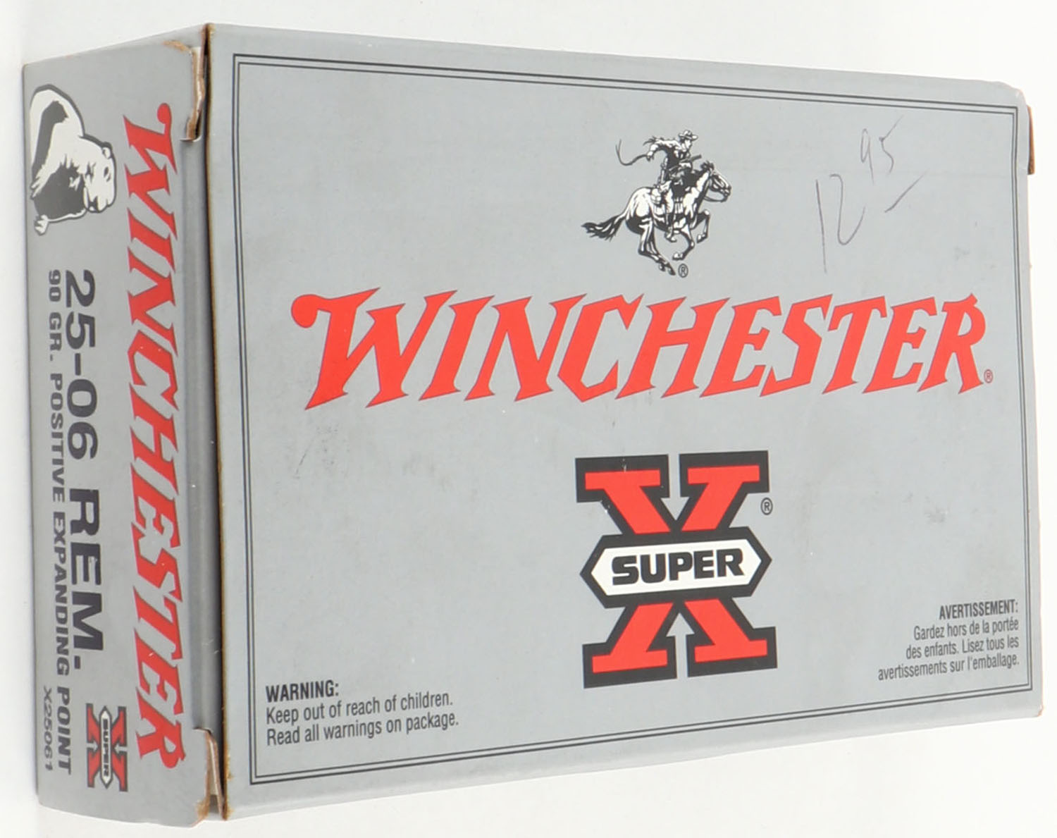 Winchester, Super X, .25-06 Remington, 90 Grain Positive Expanding Point, Full, 1pc. Silver & red box, box is near mint with minty color, top has been written on, corners are sharp, edges are crisp, end flaps are solid, ammo is excellent. Grade: Excellent ++ - Value: 16 to 60