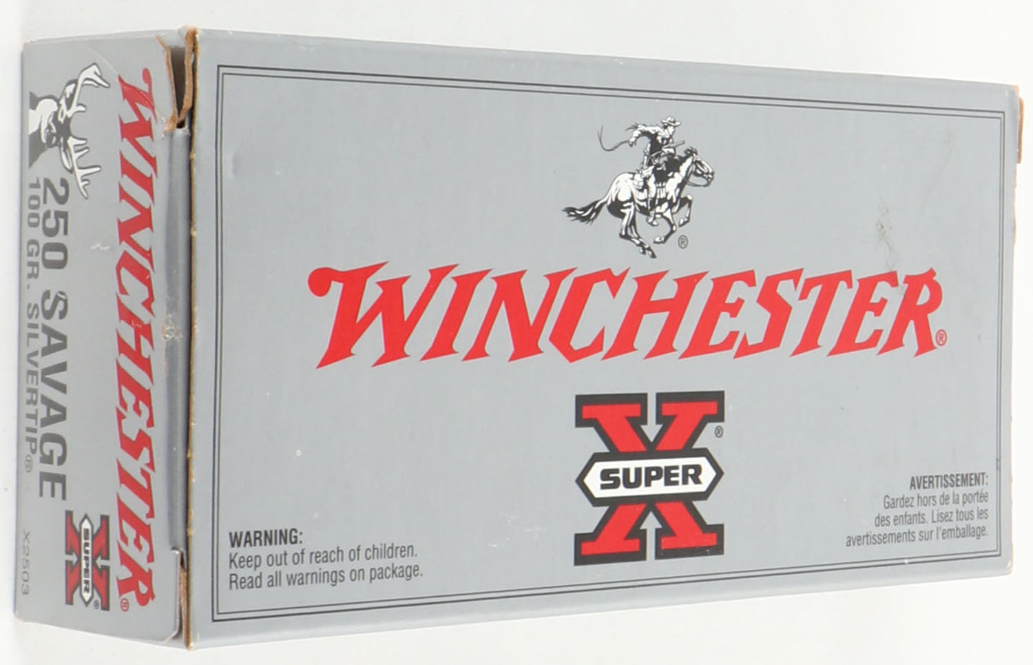 Winchester, Super X, .250 Savage, 100 Grain Silvertip, Full, 1pc. Silver & red box, box is MINT with minty color, corners are sharp, edges are crisp, end flaps are solid, ammo is minty. Grade: MINT - Value: 20 to 60