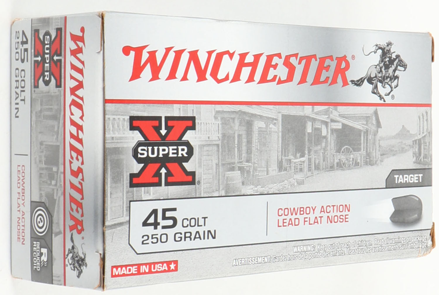 Winchester, Super X, .45 Colt Cowboy Action, 250 Grain Lead Flat Nose, Full, 1pc. Gray & red box, box is solid with minty color, minor corner wear, edges are crisp, end flaps are solid, ammo is minty. Grade: Excellent ++ - Value: 20 to 80