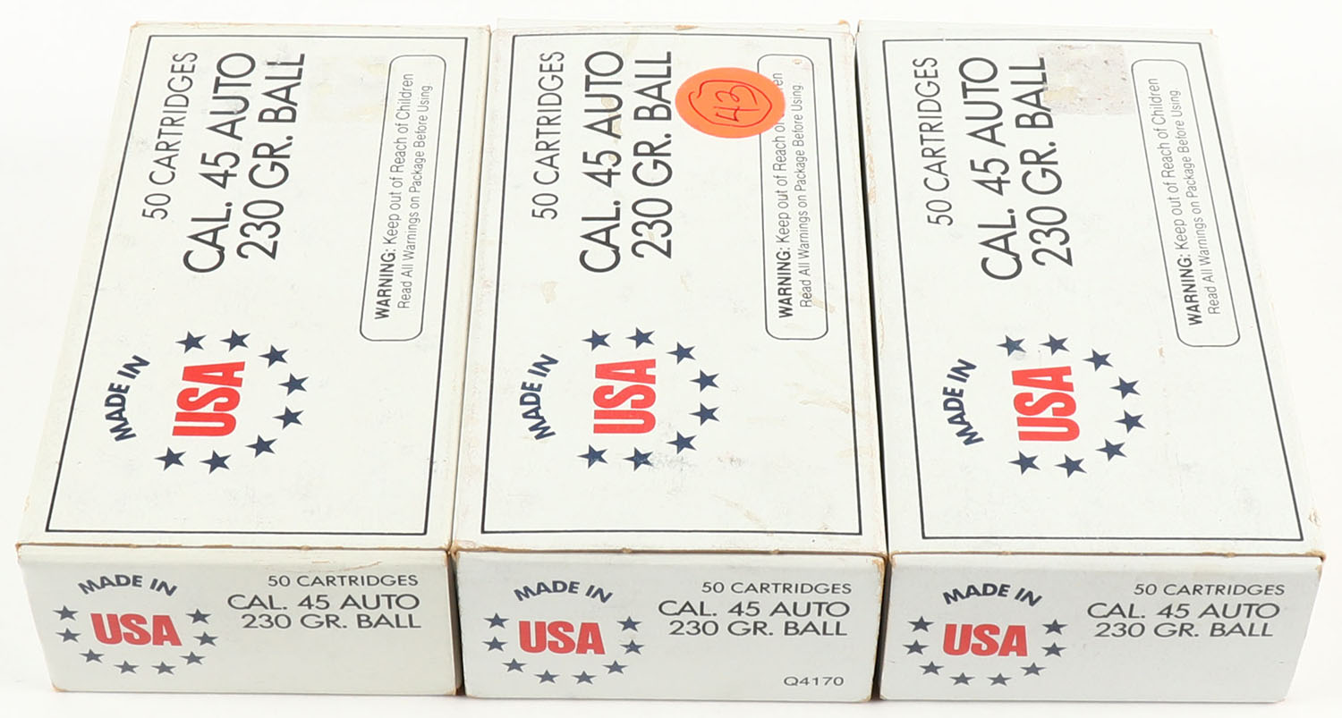 Winchester, Lot of (3), USA, .45 Auto., 230 Grain Ball, 1pc., Full, White boxes, boxes are solid with excellent color, ammo is excellent to minty. Grade: Excellent ++ - Value: 20 to 80