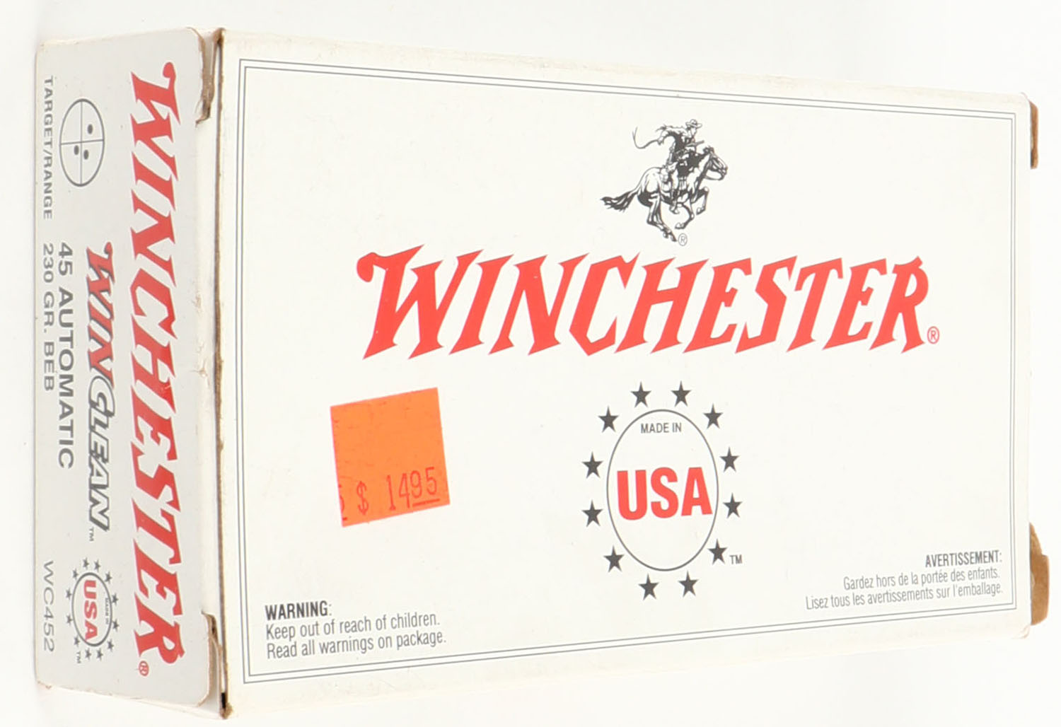 Winchester, WinClean, .45 Automatic, 230 Grain BEB (Brass Enclosed Base), Full, 1pc. White box, box is solid with excellent color, tear on right end flap, ammo is minty. Grade: Excellent + - Value: 10 to 40
