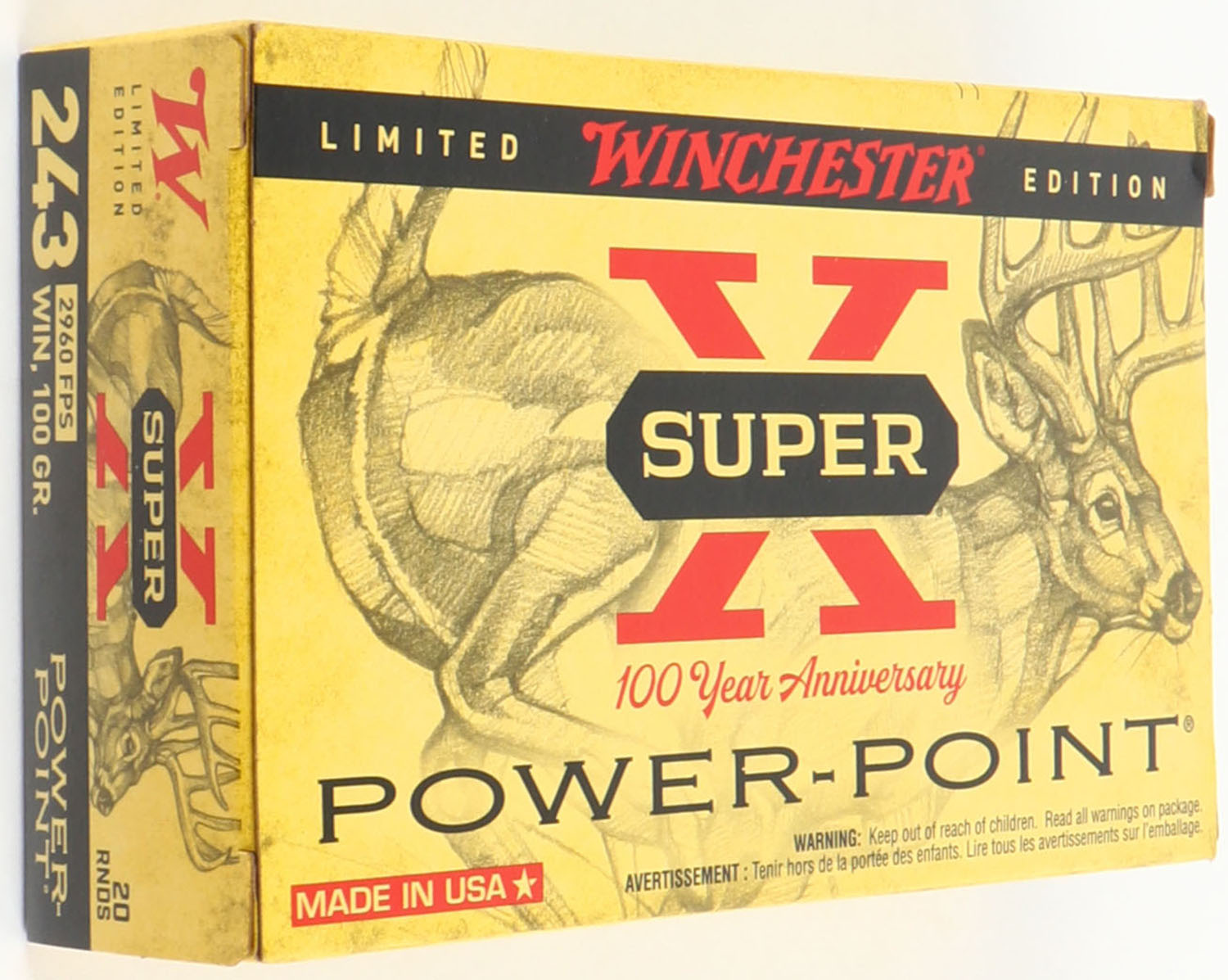 Winchester, Super X, .243 Winchester, 100 Grain Power-Point, Full, 1pc. Yellow red & black box, box is MINT with minty color, corners are sharp, edges are crisp, end flaps are solid, ammo is minty. Grade: MINT - Value: 30 to 90