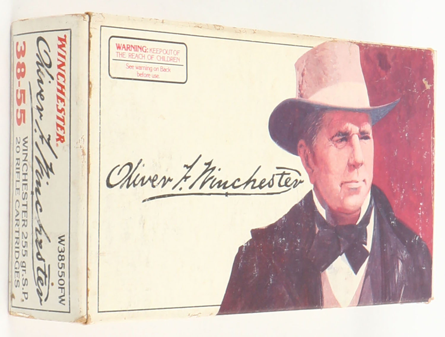 Winchester, Oliver F. Winchester, .38-55 Winchester, 255 Grain Soft Point, Full, 1pc. White box picturing Oliver Winchester, box is solid with very good color, some color fading & shelf wear, minor edge & corner wear, end flaps are solid, ammo is excellent. Grade: Very Good ++ - Value: 30 to 90