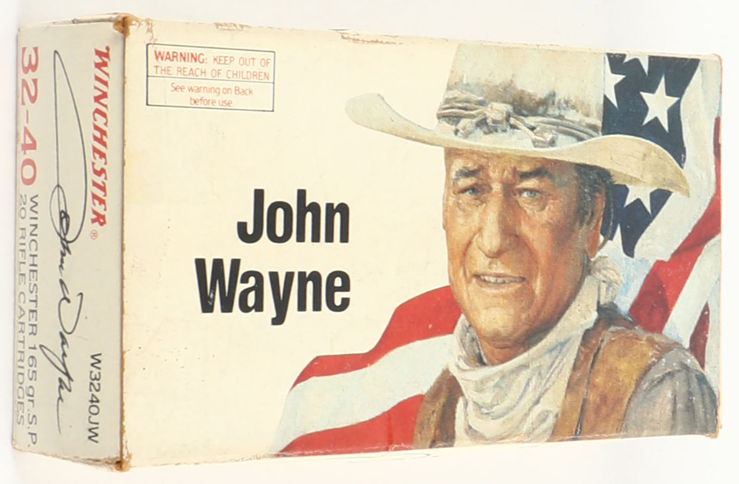 Winchester, John Wayne, .32-40 Winchester, 165 Grain Soft Point, Full, 1pc. White box featuring John Wayne, box is solid with very good color, some age soiling, crease across front of box, minor corner wear, very minor edge wear, end flaps are solid, ammo is excellent. Grade: Very Good ++ - Value: 50 to 150