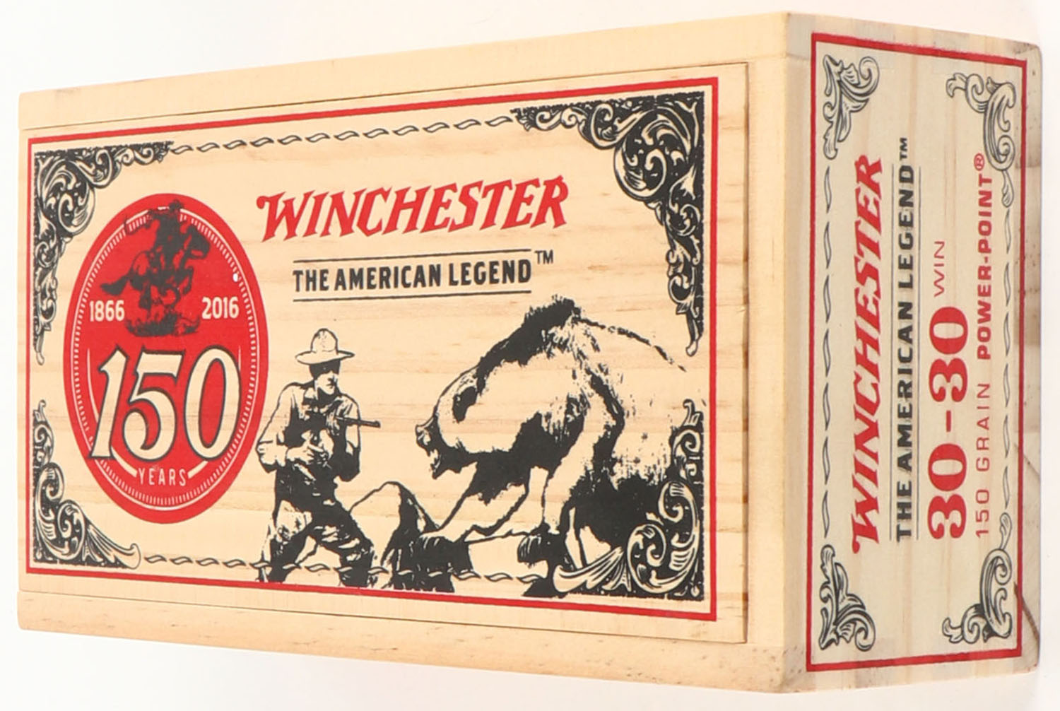 Winchester, The American Legend, 150 Year Commemorative, .30-30 Win., 150 Grain Power-Point, Full, 1pc., Wood box with silver & red box indie, wood box is mint with minty color, inside box is mint with minty color, ammo is mint. Grade MINT - Value: 50 to 150
