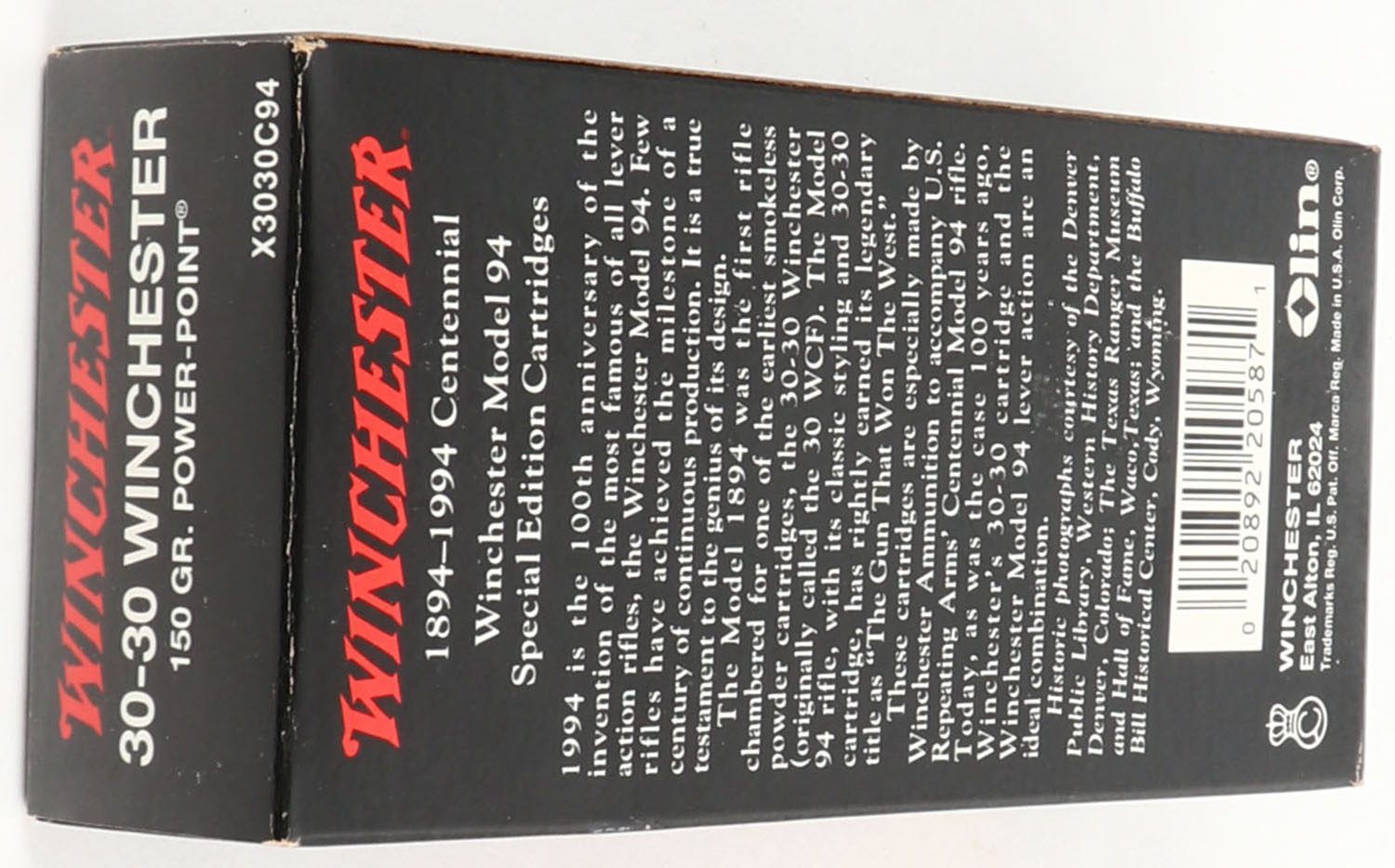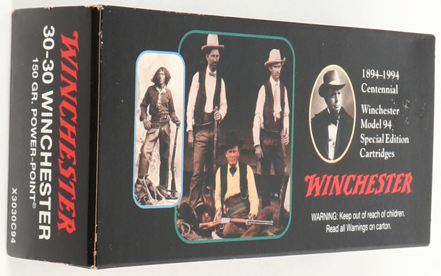 Winchester, Centennial 1894-1994 Winchester Model 94 Special Edition, .30-30 Winchester, 150 Grain Power-Point, Partial 17rds., 1pc. Black box, box is near mint with minty color, only very minor shelf wear, corners are sharp, edges are crisp, end flaps are solid, ammo is minty. Grade: Excellent ++ - Value: 20 to 60