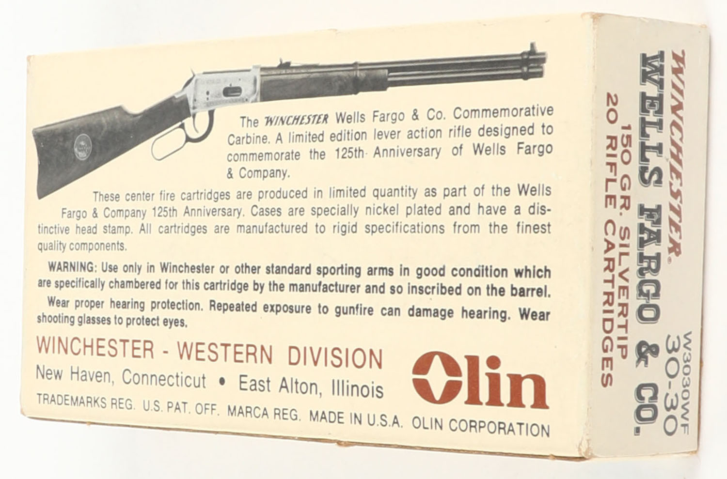Winchester, Wells Fargo & Co., .30-30 Winchester, 150 Gr. Silvertip, Full, 1pc. Tan brown & black box, box is solid with minty color, scuffing on top, very minor corner wear, edges are crisp, end flaps are solid, ammo is minty. Grade: Excellent + - Value: 30 to 90
