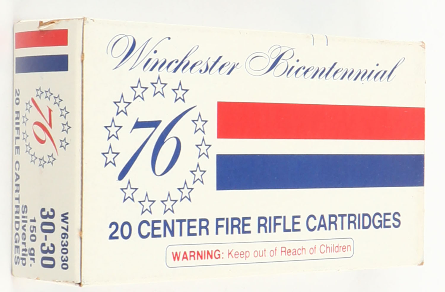 Winchester, Bicentennial, .30-30 Winchester, 150 Gr. Silvertip, Full, 1pc. White blue & red box, box is solid with excellent color, very minor corner wear, edges are crisp, end flaps are solid, ammo is minty. Grade: Excellent ++ - Value: 20 to 60