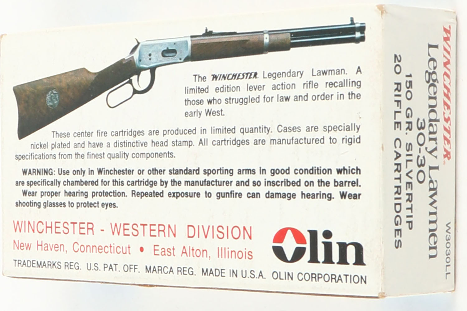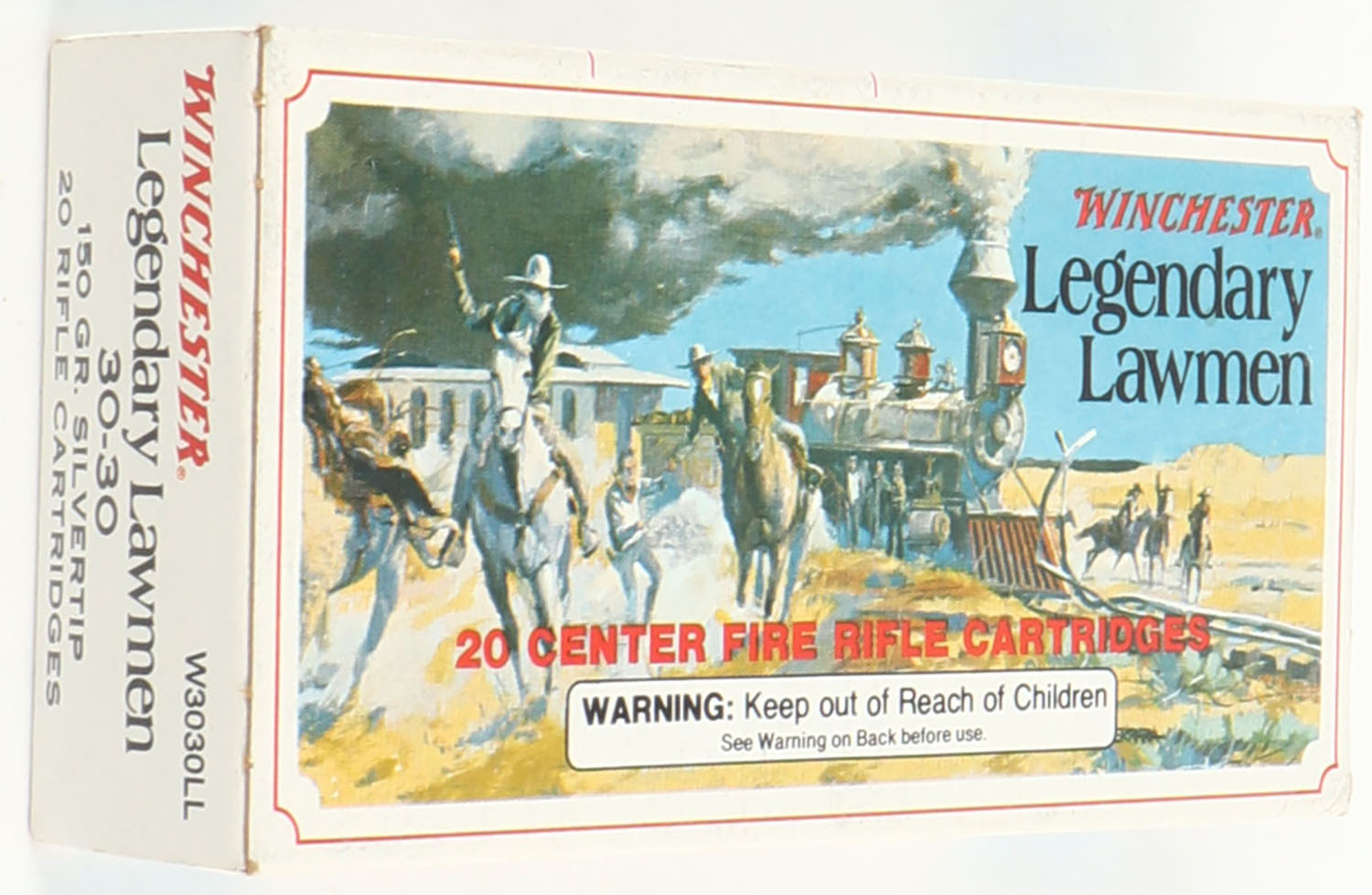 Winchester, Legendary Lawmen, .30-30 Winchester, 150 Gr. Silvertip, Full, 1pc. Multi-colored box, box is solid with excellent color, very minor age soiling & corner wear, edges are crisp, end flaps are solid, end flaps are solid, ammo is minty. Grade: Excellent ++ - Value: 40 to 120