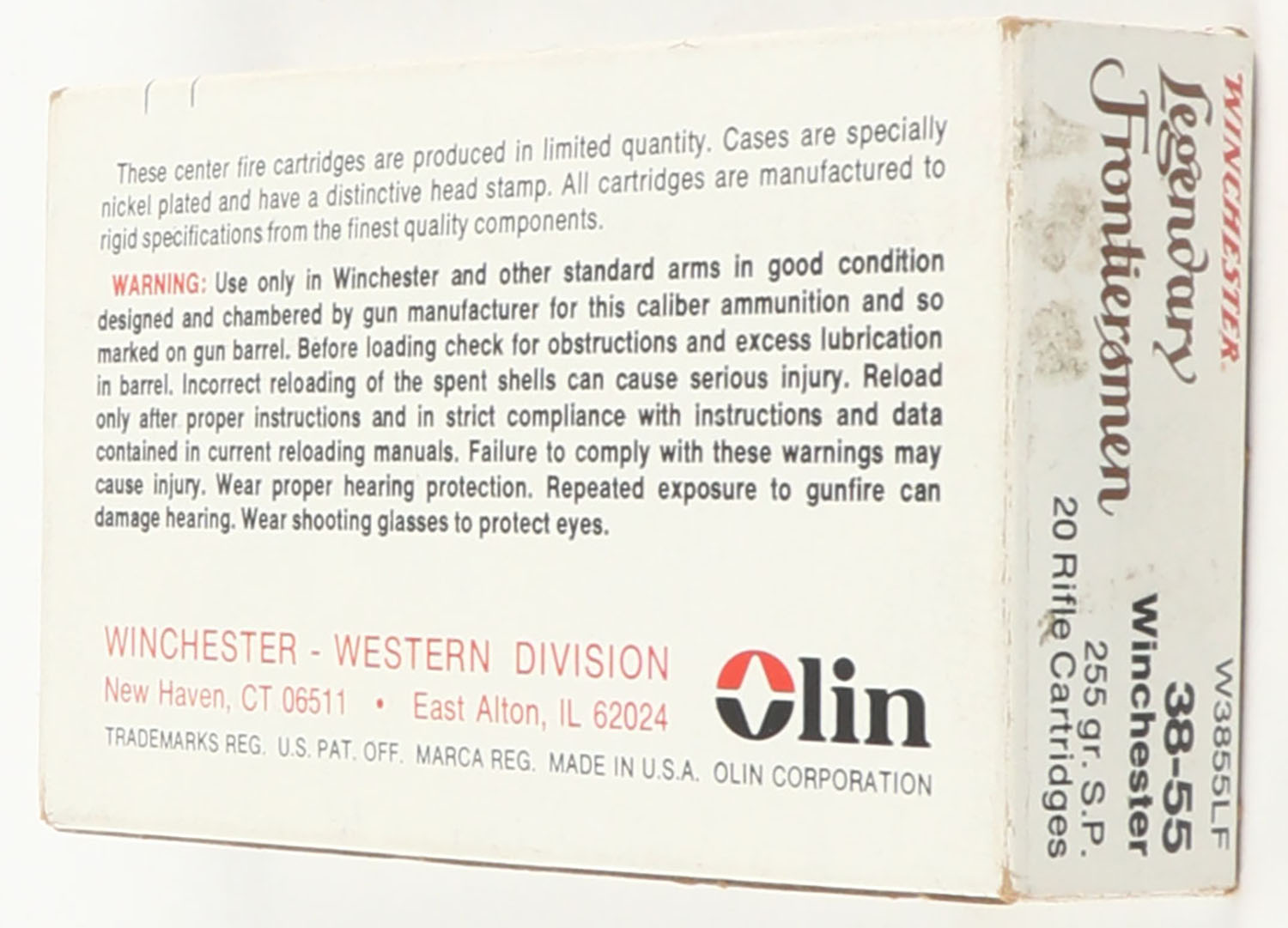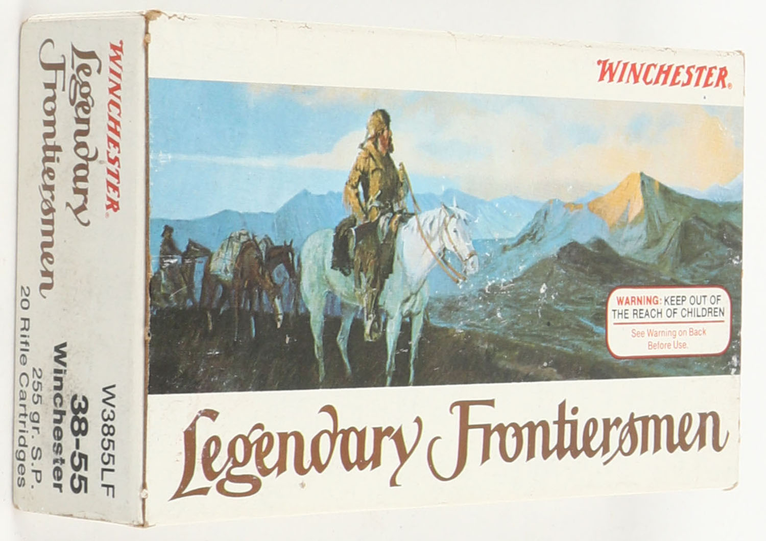 Winchester, Legendary Frontiersmen, .38-55 Winchester, 255 Grain Soft Point, Full, 1pc. Multi-colored box, box is solid with excellent color, very minor age soiling & shelf wear, corners are mostly sharp, edges are crisp, end flaps are solid, ammo is excellent to minty. Grade: Excellent + - Value: 40 to 120