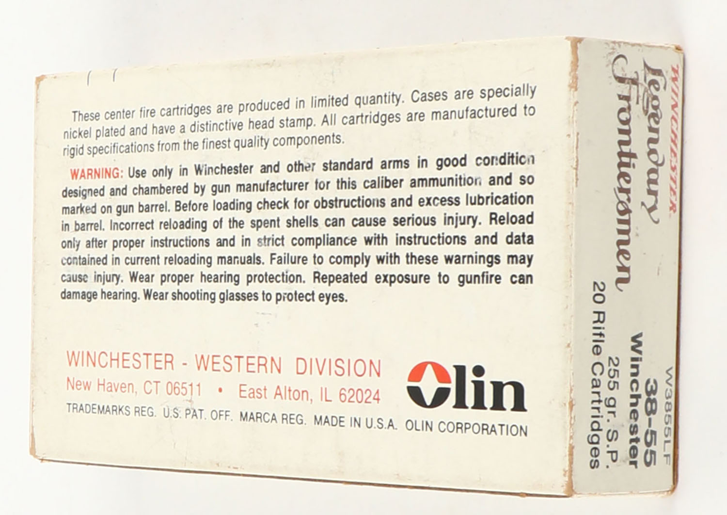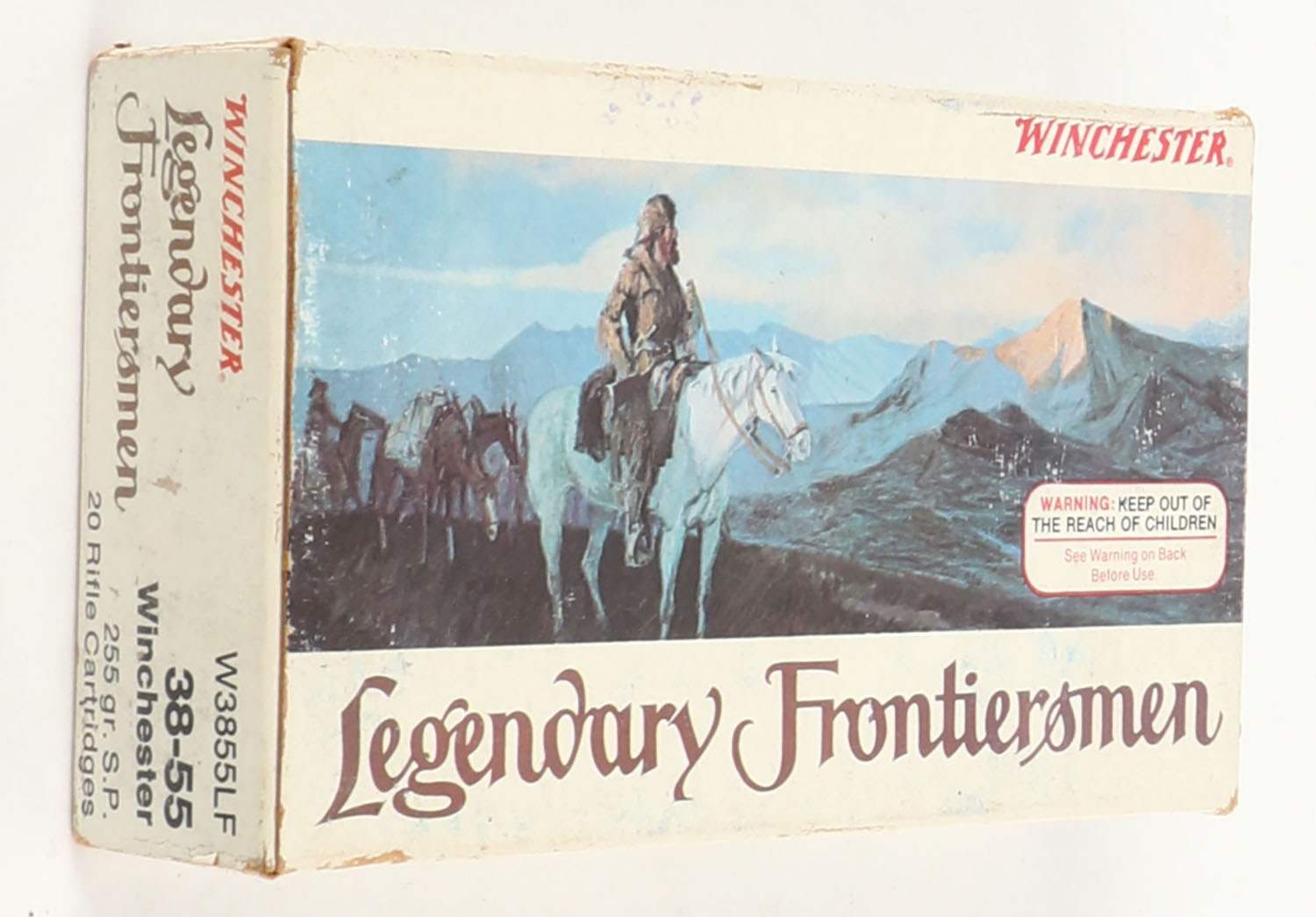 Winchester, Legendary Frontiersmen, .38-55 Winchester, 255 Grain Soft Point, Partial 19rds. Multi-colored box, box is solid with excellent color, some minor age soiling & shelf wear, minor edge & corner wear, end flaps are solid, ammo is excellent to minty. Grade: Excellent - Value: 20 to 80