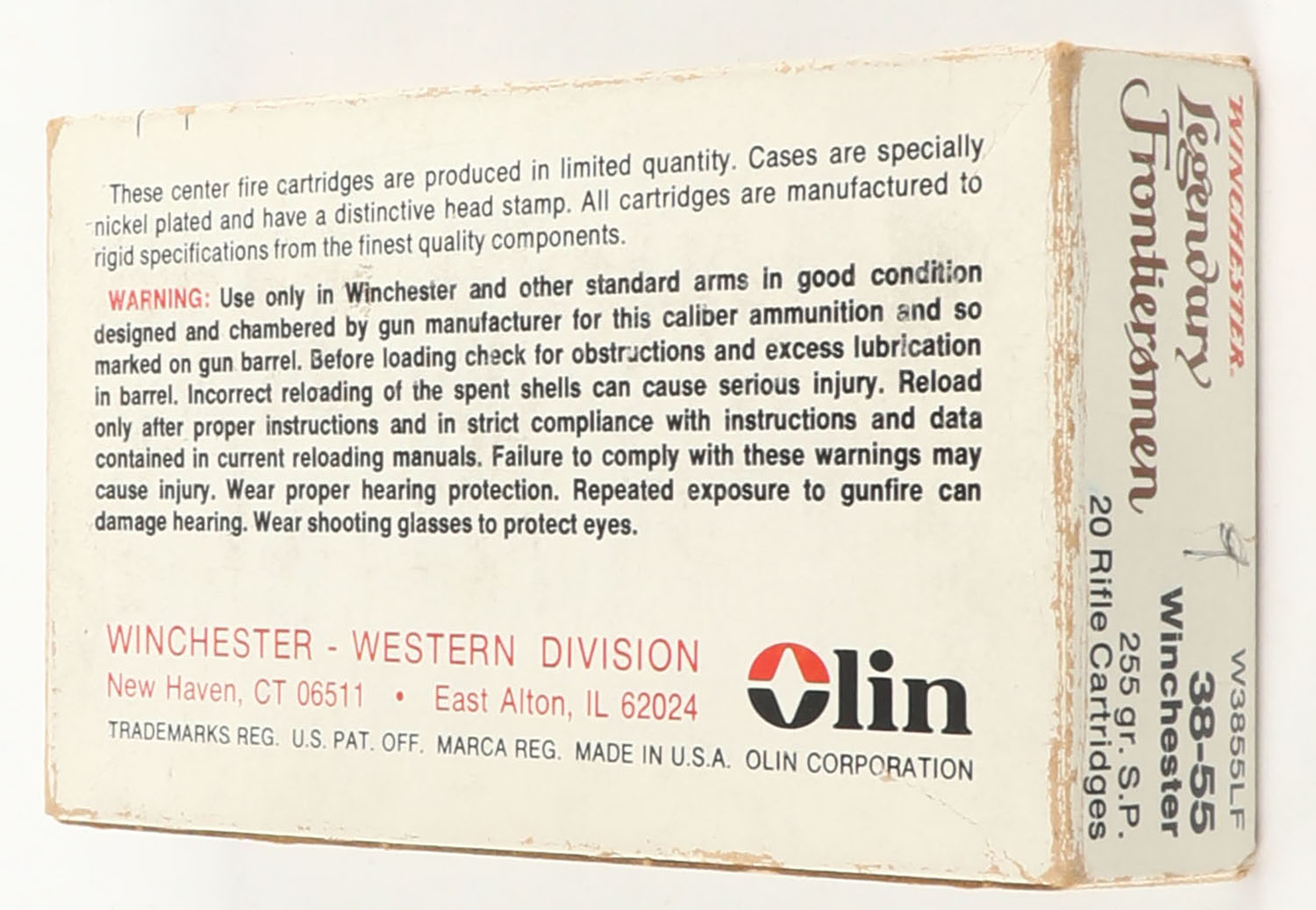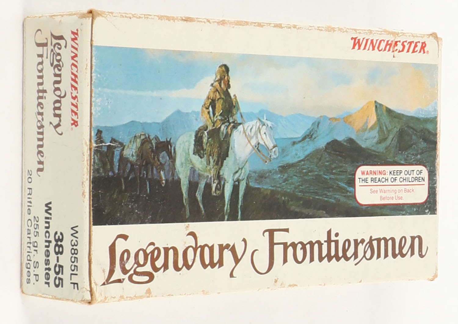 Winchester, Legendary Frontiersmen, .38-55 Winchester, 255 Grain Soft Point, Full, 1pc. Multi-colored box, box is solid with excellent color, very minor age soiling & shelf wear, corner wear, minor edge wear,, end flaps are solid, ammo is excellent to minty. Grade: Very Good ++ - Value: 30 to 90