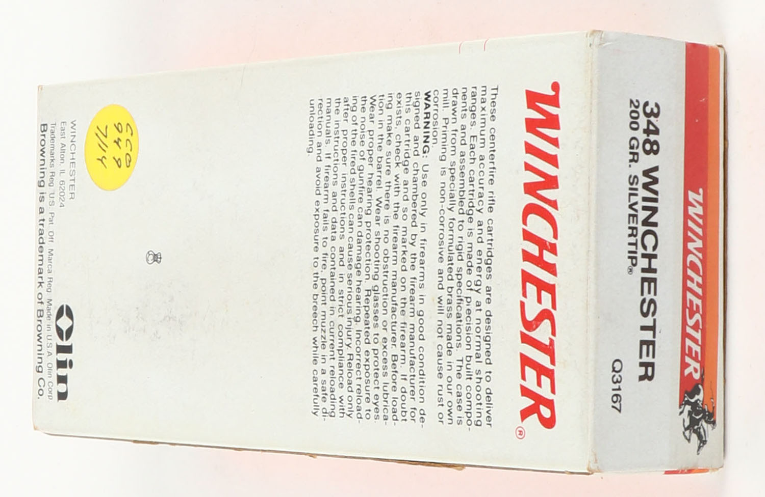 Winchester, Commemorative Ammunition for Browning Model '71, .348 Winchester, 200 Grain Silvertip, Full, 1pc. White & black box, box is solid with excellent color, some shelf & corner wear, edges are mostly crisp, end flaps are solid, ammo is excellent. Grade: Excellent + - Value: 40 to 120