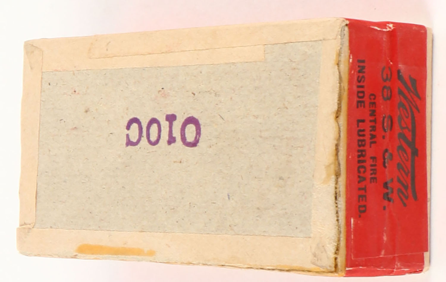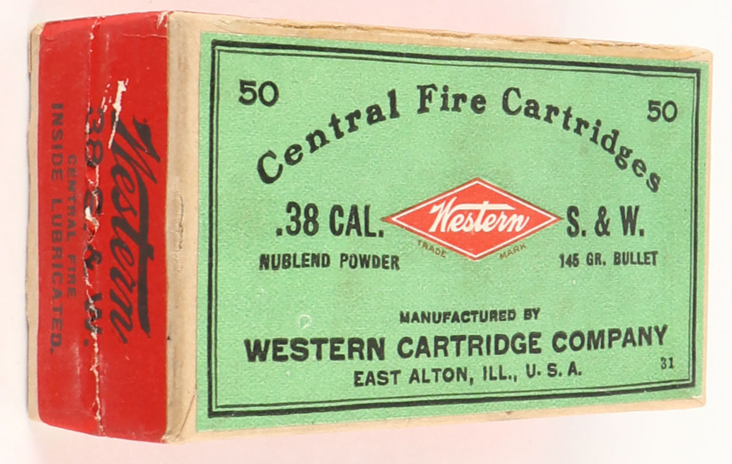 Western, Central Fire Cartridges, .38 Smith & Wesson, Nublend Powder, 145 Grain Bullet, FULL & SEALED, 2pc. Buff box with green top & red side sealing labels, box is solid with excellent color, repaired seam splits to bottom back & right seams, very minor shelf wear, corners are mostly sharp, edges are crisp, labels are intact. Grade: Very Good + - Value: 40 to 120