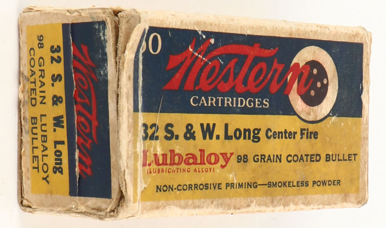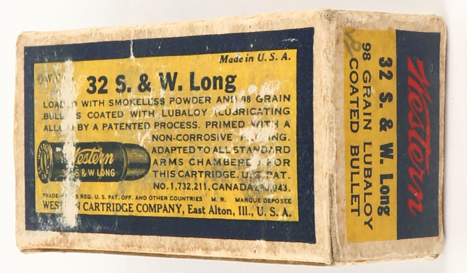 Western, Lubaloy Cartridges, .32 Smith & Wesson Long, 98 Grain Coated Bullet, Full, 1pc. Yellow blue & red bulls eye box, left end flap is torn, very good color, age soiling, corner wear, some edge wear, right end flap is solid, ammo is excellent. Grade: Good ++ - Value: 16 to 60