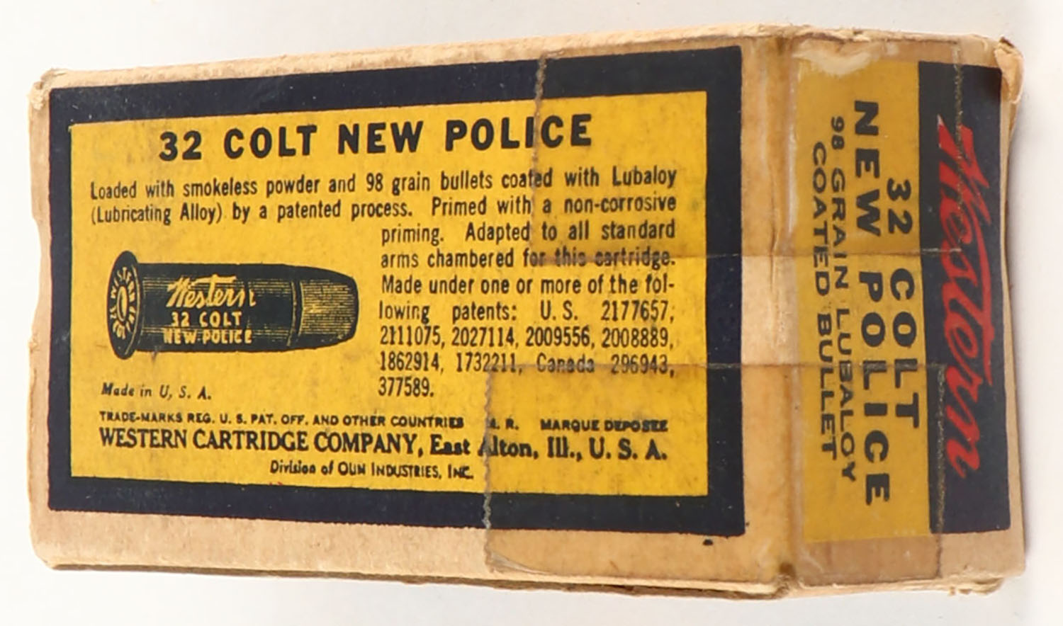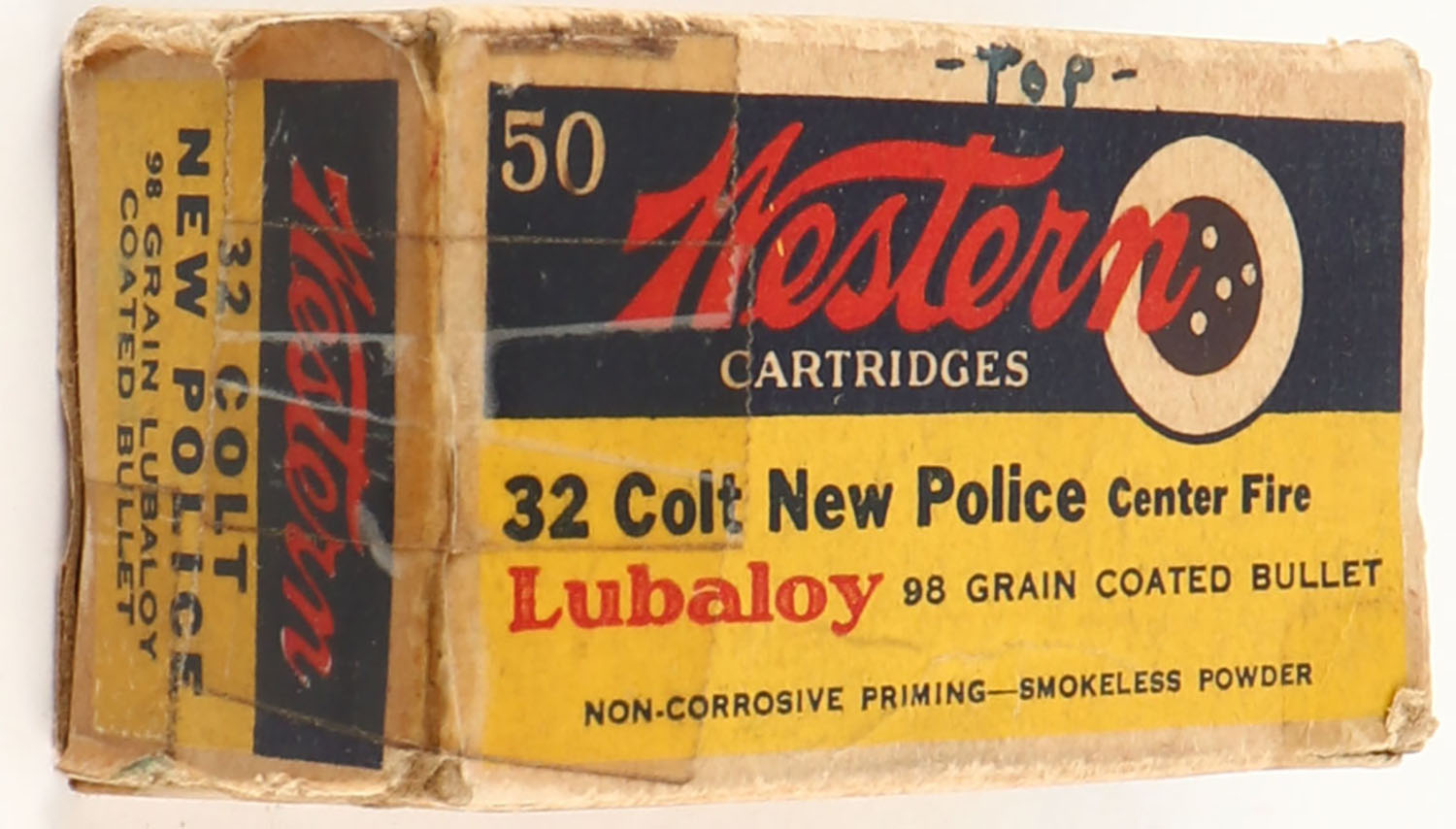 Western, Lubaloy Cartridges, .32 Colt New Police, 98 Grain Coated Bullet, Full, 1pc. Yellow blue & red bulls eye box, box has tape on both ends, very good color, some age soiling, top has been written on, corner wear, some edge wear, ammo is excellent. Grade: Good + - Value: 10 to 50