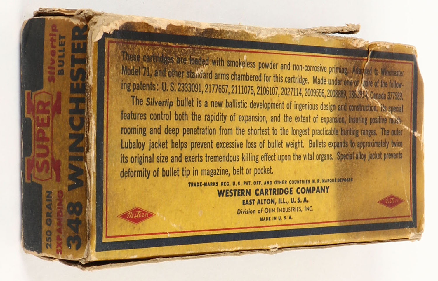 Western, Super-X Silvertip, .348 Winchester, 250 Grain Controlled Expanding Bullet, Full, 1pc. Yellow blue & red bear box, missing left end flap, right end flap is torn, back side of box is torn, fair color, significant age soiling, top has been written on, edge & corner wear, ammo is good. Grade: Fair - Value: 10 to 40
