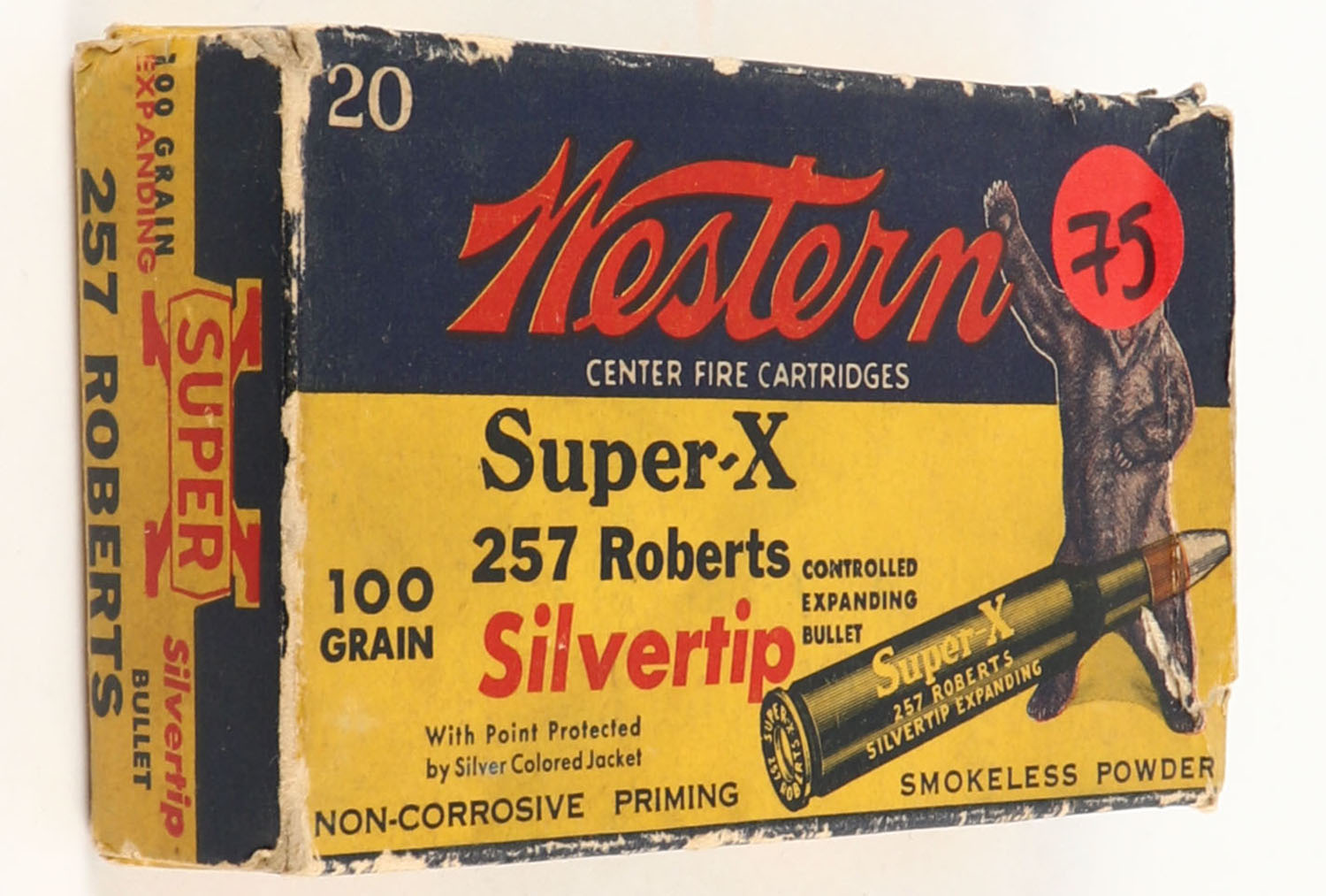 Western, Super-X Silvertip, .257 Roberts, 100 Grain Controlled Expanding Bullet, Full, 1pc. Yellow blue & red bear box, box is solid with excellent color, minor age soiling, some edge & corner wear, sticker on top, end flaps are solid, ammo is excellent. Grade: Very Good ++ - Value: 60 to 180
