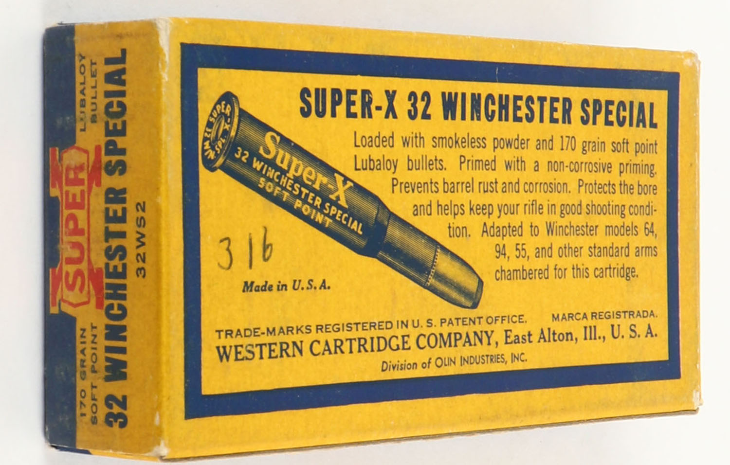 Western, Super-X, .32 Winchester Special, 170 Grain Soft Point Lubaloy Bullet, Full of fired brass, 1pc. Yellow blue & red box, box is solid with excellent color, minor corner wear, edges are mostly crisp, end flaps are solid, brass is excellent. Grade: Excellent + - Value: 10 to 50