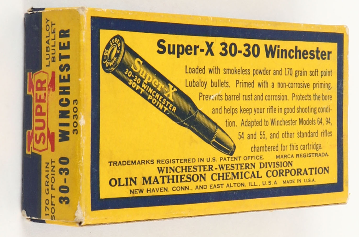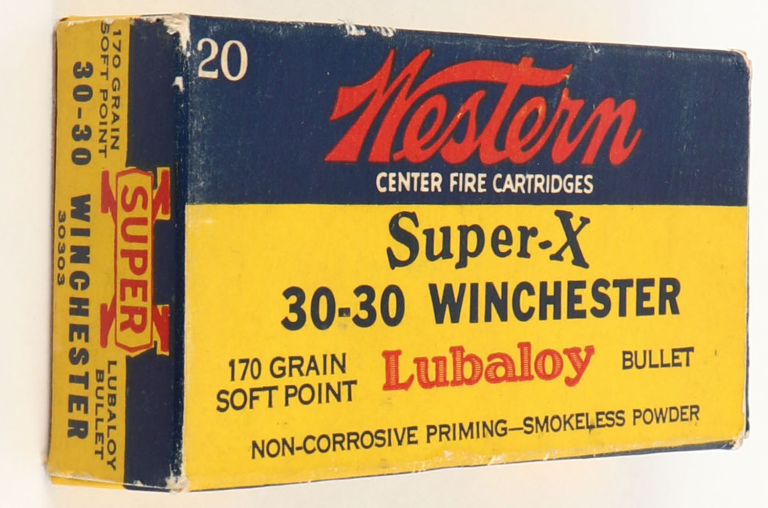 Western, Super-X, .30-30 Winchester, 170 Grain Soft Point Lubaloy Bullet, Partial 15rds. of incorrect ammo, 1pc. Yellow blue & red box, box is solid with excellent color, minor corner wear, edges are mostly crisp, end flaps are solid, ammo is excellent. Grade: Excellent ++ - Value: 8 to 40