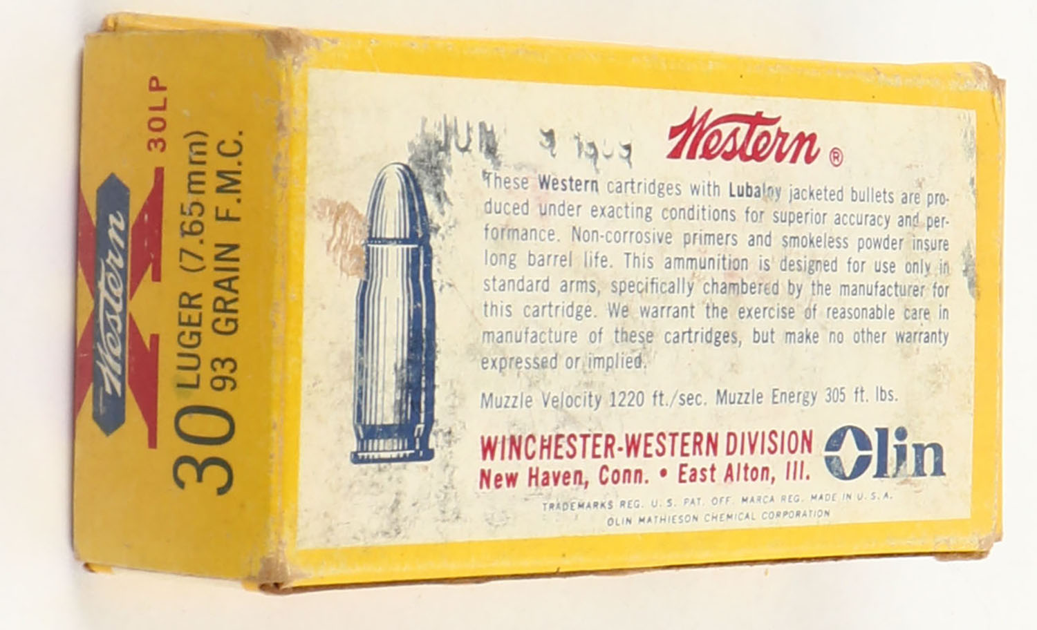 Western, X, S.A.A.M.I. Reference Ammunition, .30 Luger, 93 Grain Full Metal Case, Full, 1pc. Yellow white & red box with white SAAMI over-label, date stamps throughout (Jun 9 1969), box is solid with very good to excellent color, very minor age soiling & shelf wear, minor edge & corner wear, end flaps are solid, ammo is excellent. Grade: Excellent - Value: 16 to 60