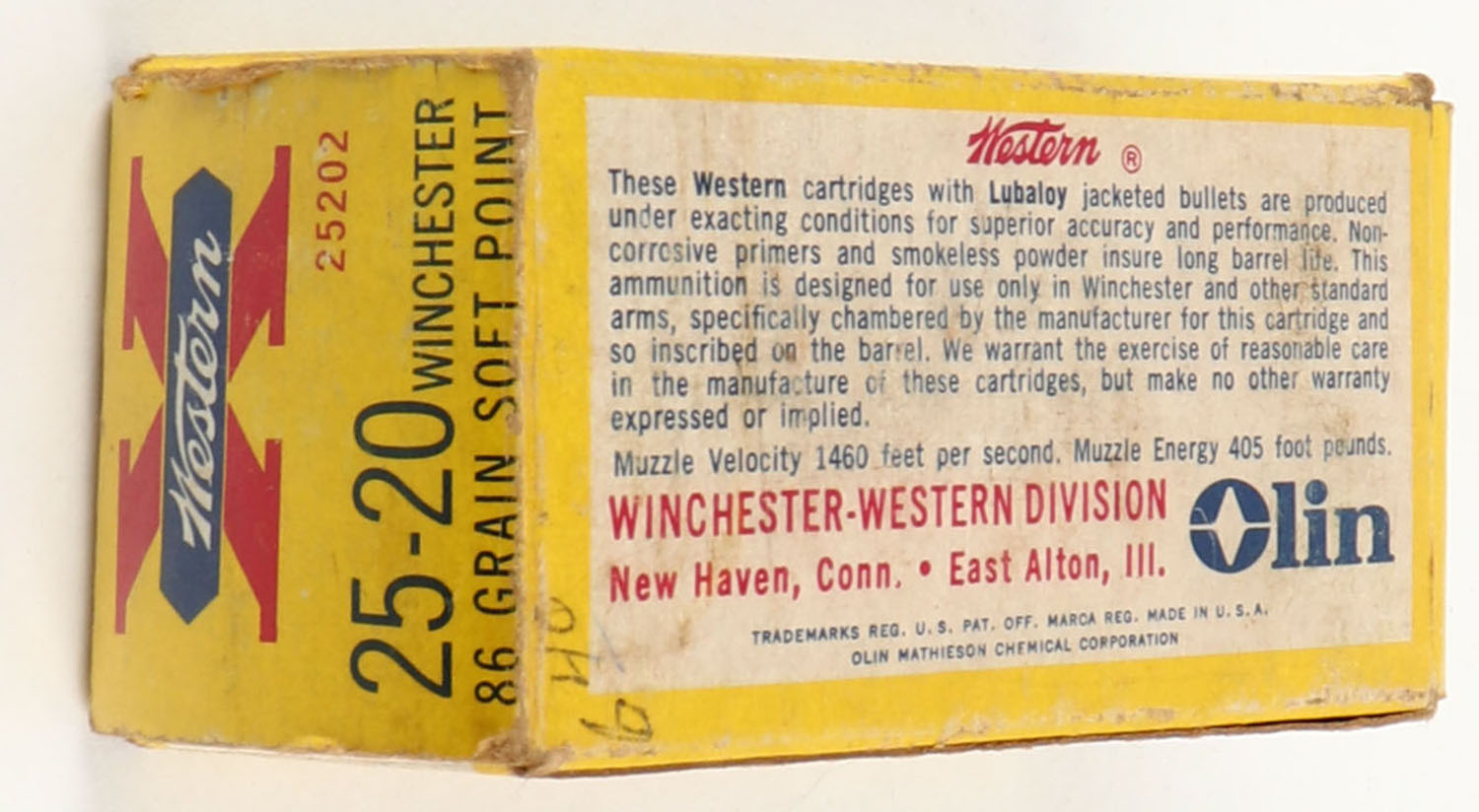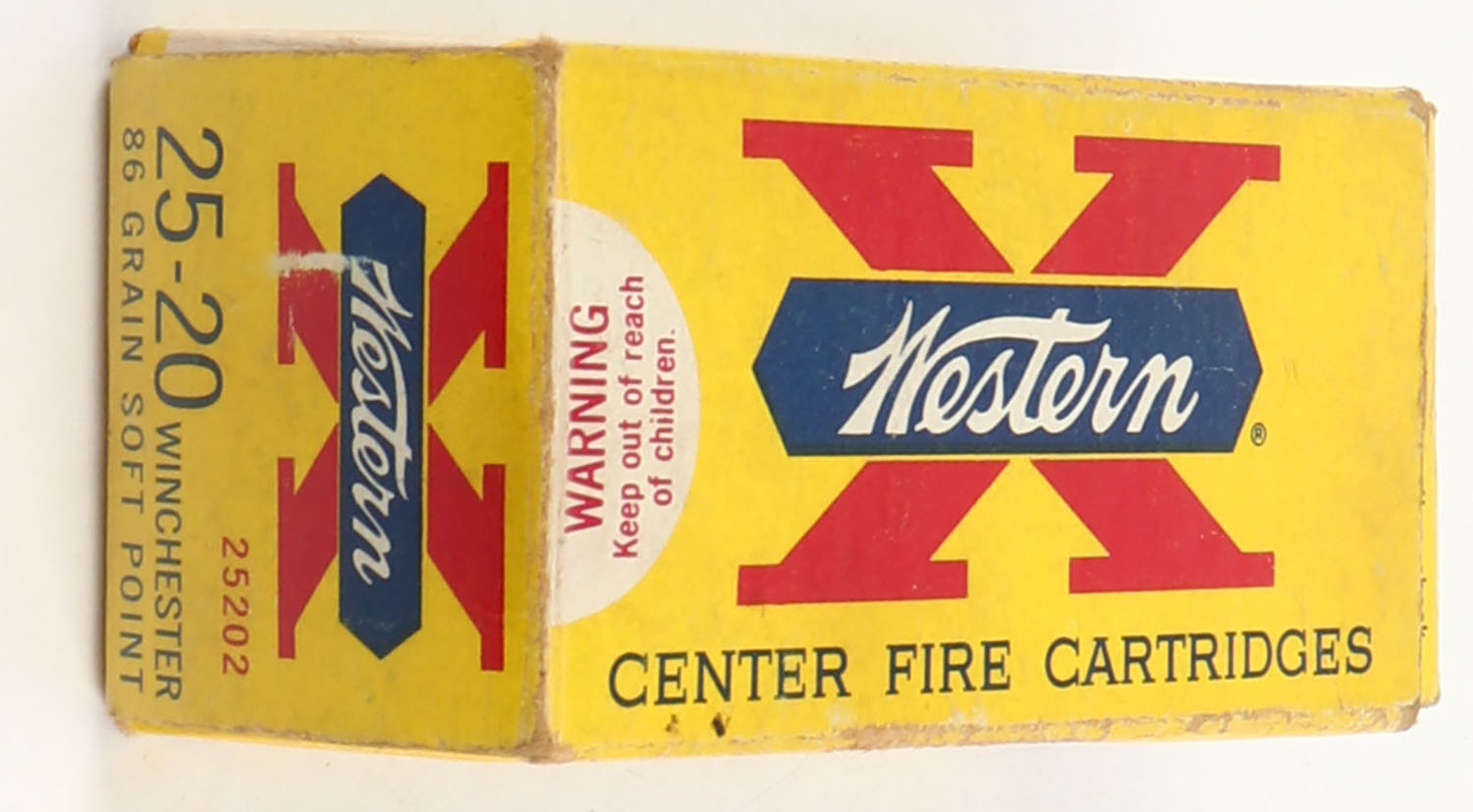 Western, X, .25-20 Winchester, 86 Grain Soft Point, Partial 19rds. (14rds. correct), 1pc. Yellow white & red box, box is solid with excellent color, very minor age soiling & shelf wear, minor edge & corner wear, end flaps are solid, ammo is excellent. Grade: Excellent - Value: 16 to 60