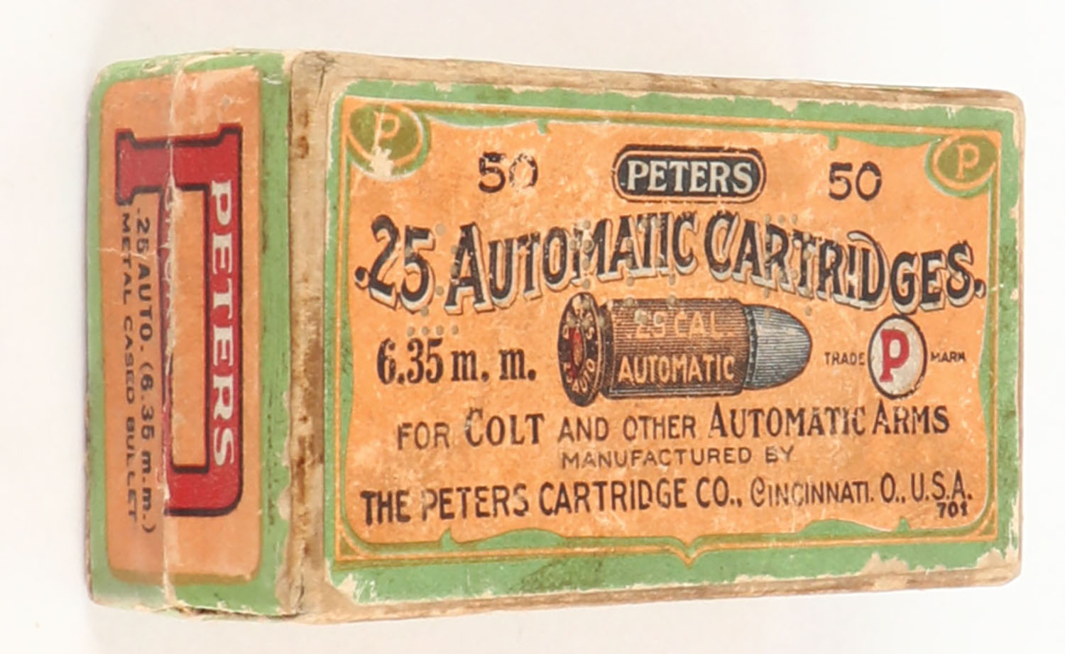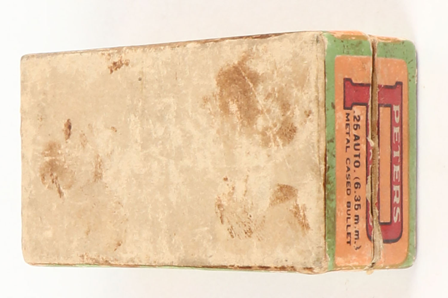 Peters, .25 Automatic, 6.35mm, Metal Cased Bullet, Partial 38rds., 2pc. Buff box with orange/green top & side sealing labels, box is solid with very good to excellent color, some age soiling & shelf wear, vertical seam splits to left corners of lid, minor edge & corner wear, labels are intact, ammo is excellent. Grade: Very Good ++ - Value: 14 to 40