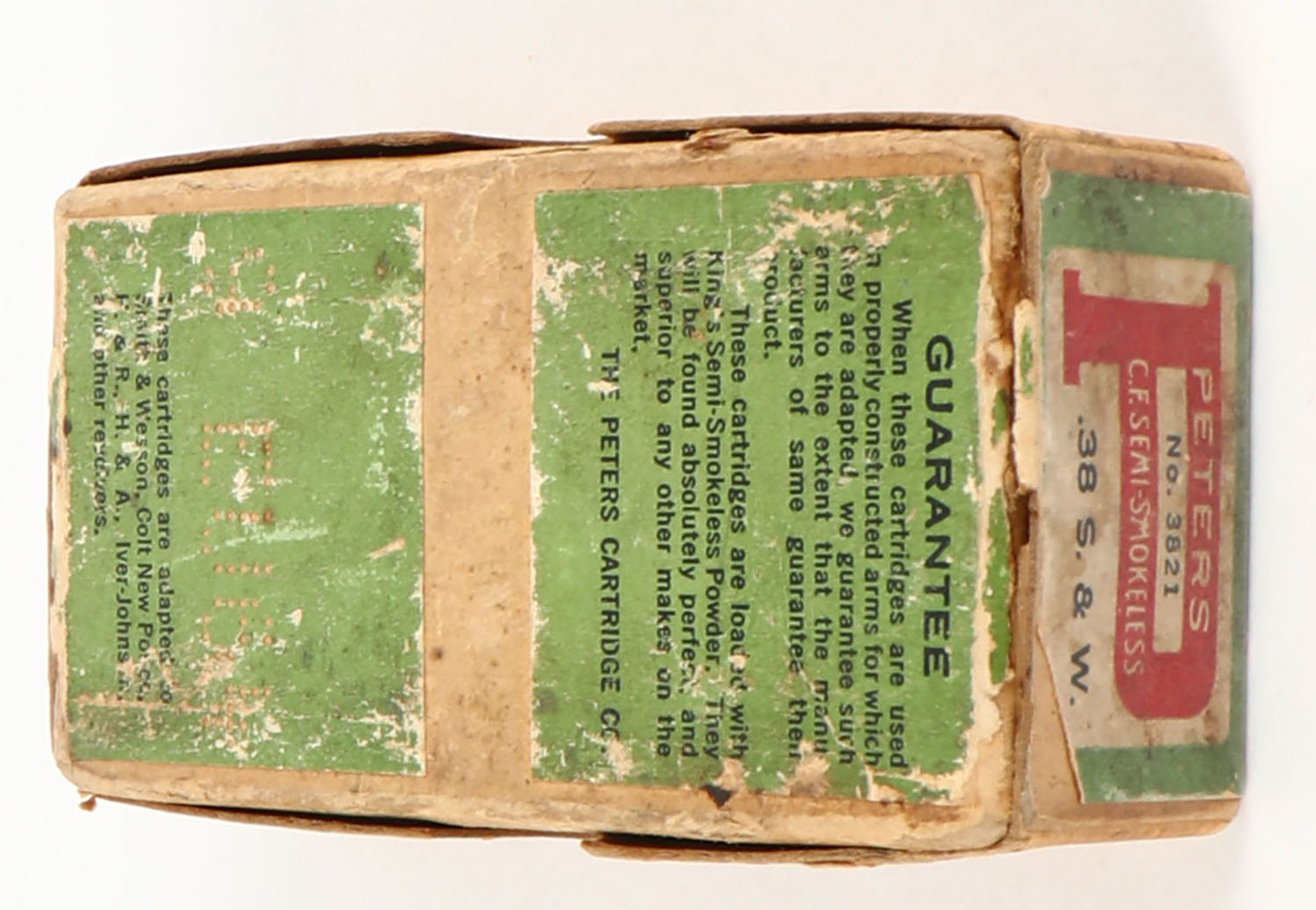Peters, C.F. Cartridges, .38 Smith & Wesson, Semi-Smokeless Powder, Partial 19rds. 2pc. Buff box with white green & red wraparound label, box is solid with good color, age soiling, shelf wear, some edge & corner wear, label is intact, ammo is very good. Grade: Very Good - Value: 14 to 40