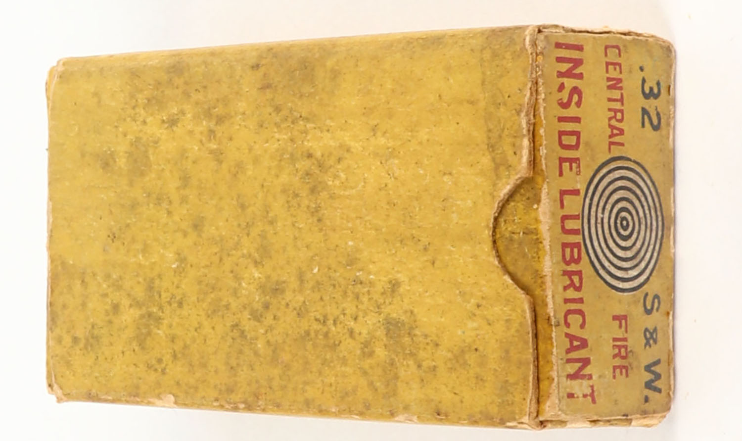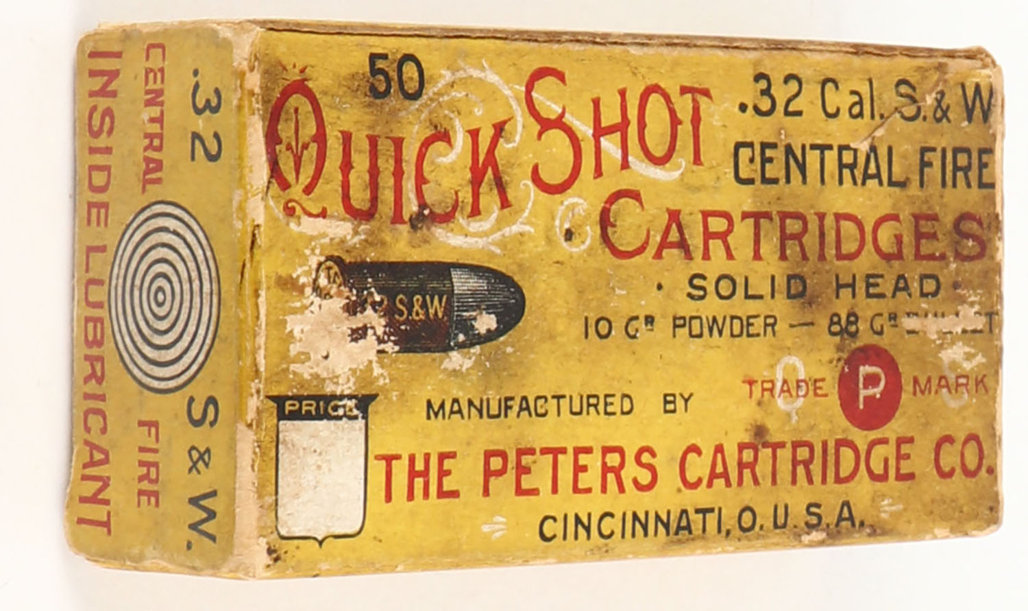 Peters, Quick Shot Cartridges, .32 Smith & Wesson, 88 Grain Solid Head, Partial 19rds., 1pc. Yellow red & black box, box is solid with good to very good color, age soiling, some shelf wear, minor edge & corner wear, end flaps are solid, ammo is excellent. Grade: Very Good + - Value: 50 to 150