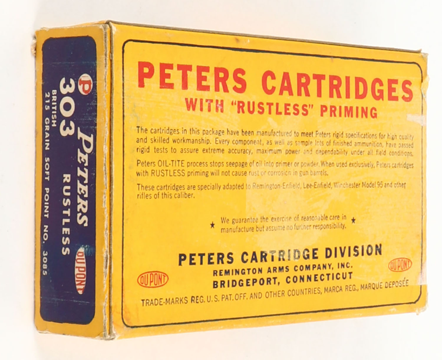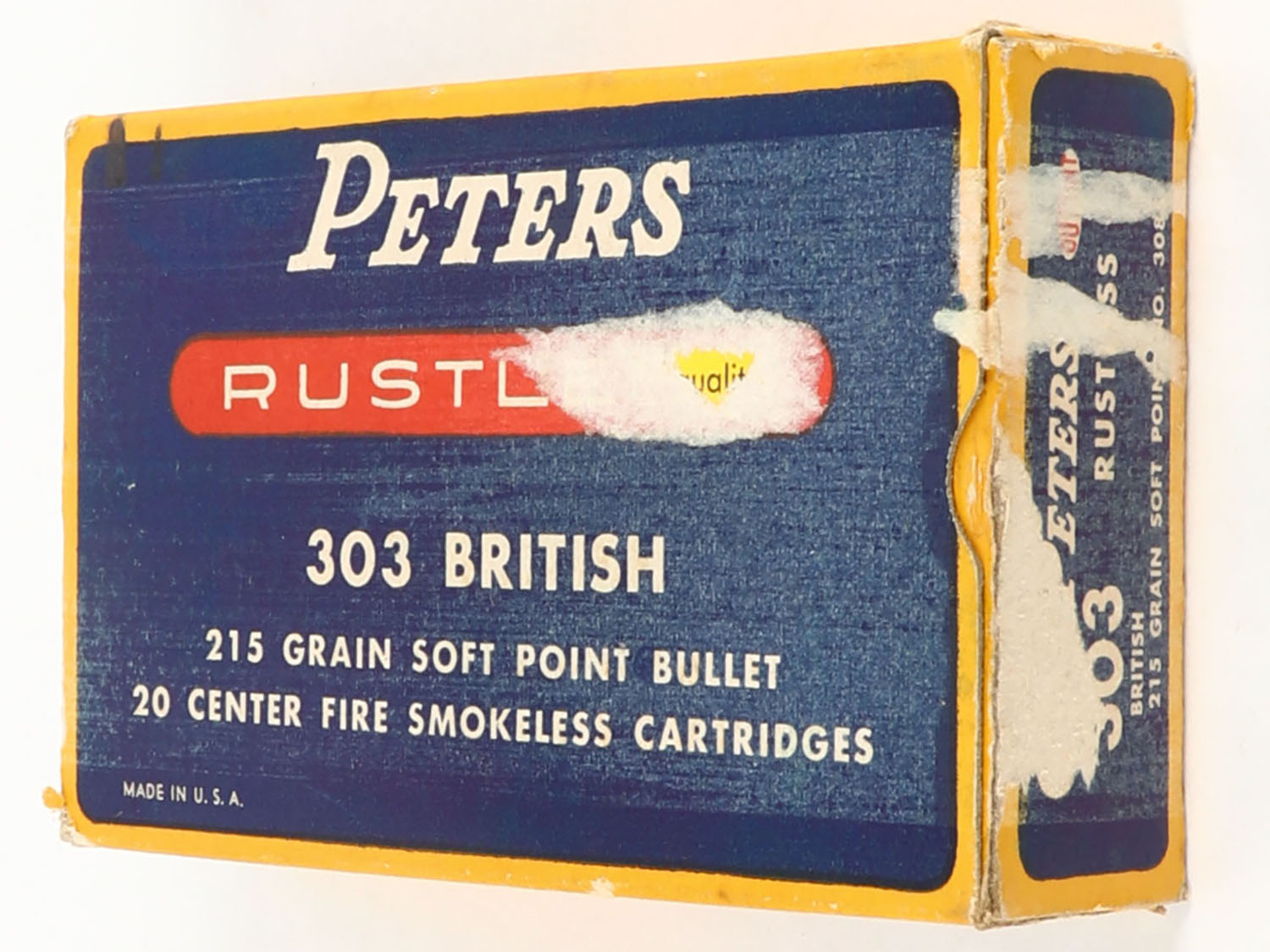 Peters, Rustless, .303 British, 215 Grain Soft Point Bullet, Full (all correct H/S but 10 rds. with nickel primers, 10rds. with brass primers), 1pc. Blue yellow & red box, box is solid with excellent color, box appears to have had an over-label on top at one point, scuffing on right end, minor corner wear, edges are mostly crisp, end flaps are solid, ammo is excellent. Grade: Very Good ++ - Value: 20 to 60