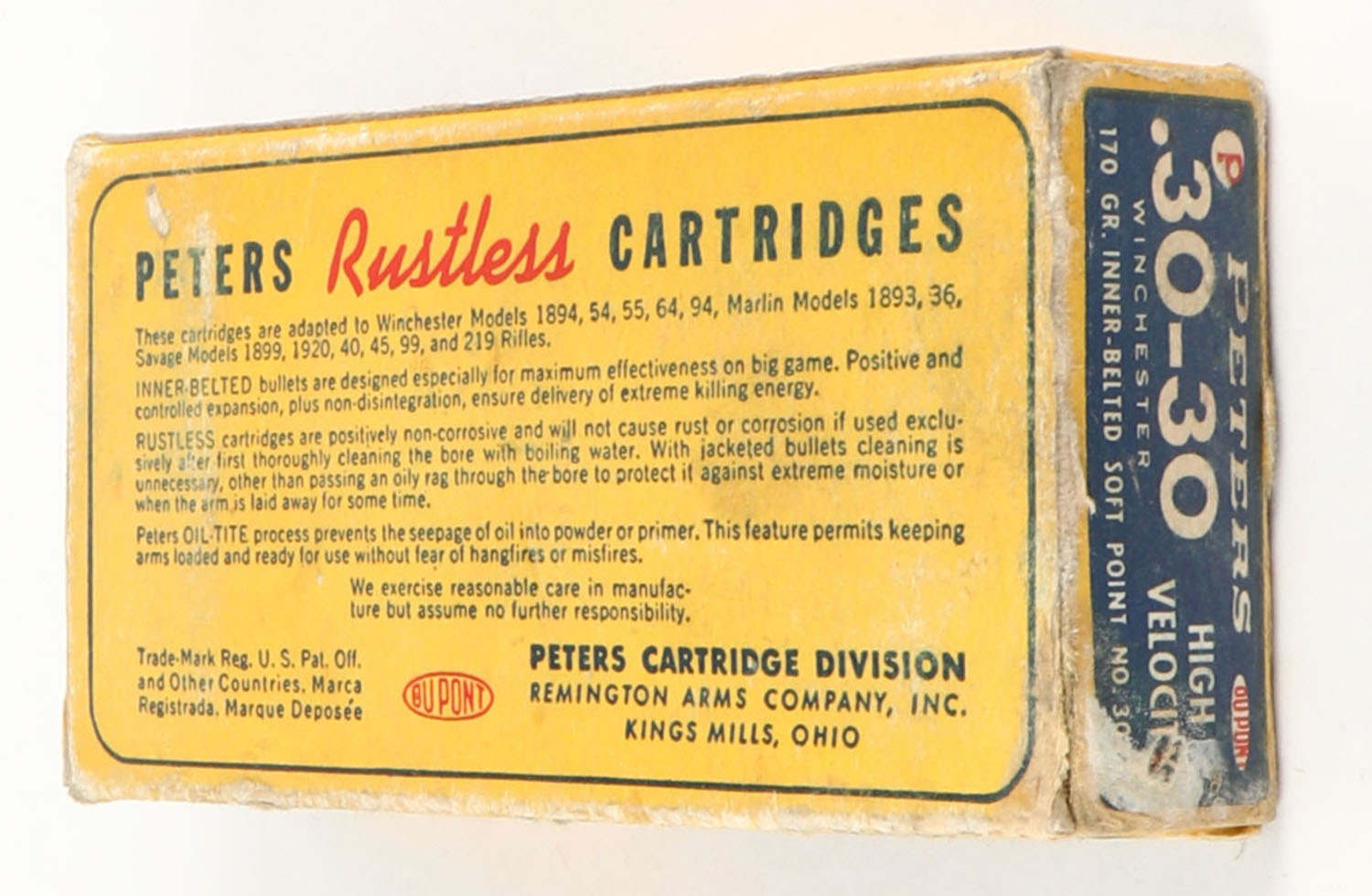 Peters, High Velocity, .30-30 Winchester, 170 Grain Inner-Belted Soft Point Bullet, Full, 1pc. Blue yellow & red box, box is solid with very good color, some age soiling & shelf wear, some edge & corner wear, end flaps are solid, ammo is excellent. Grade: Very Good + - Value: 16 to 60