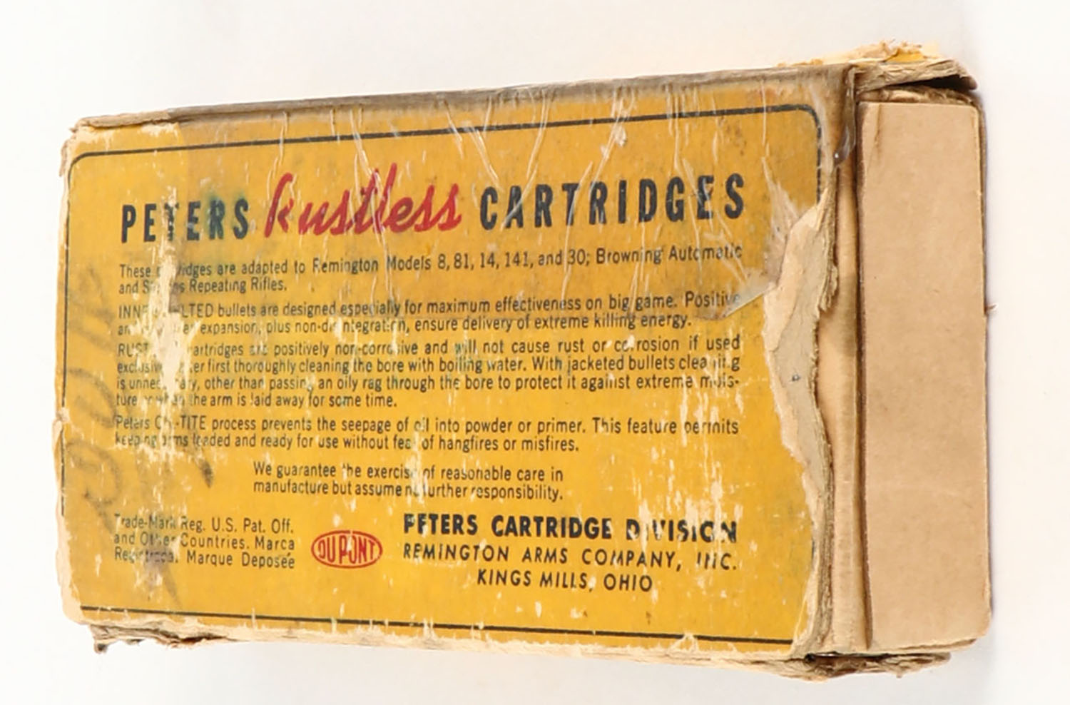 Peters, High Velocity, .35 Remington, 200 Grain Inner-Belted Hollow Point Bullet, Partial 12rds., 1pc. Blue yellow & red box, box is missing both end flaps, good color, minor age soiling, shelf wear, tape on front & bottom, edge & corner wear, ammo is good. Grade: Fair ++ - Value: 6 to 30