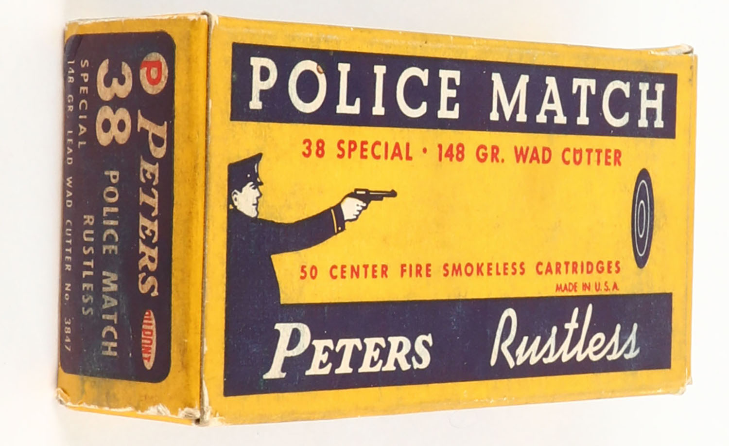 Peters, Police Match, .38 Special, 148 Grain Lead Wad Cutter, Full, 1pc. Yellow blue & red box, box is solid with excellent color, minor age soiling, some shelf wear on front, very minor corner wear, edges are crisp, end flaps are solid, ammo is excellent. Grade: Excellent. Grade: Excellent - Value: 20 to 60