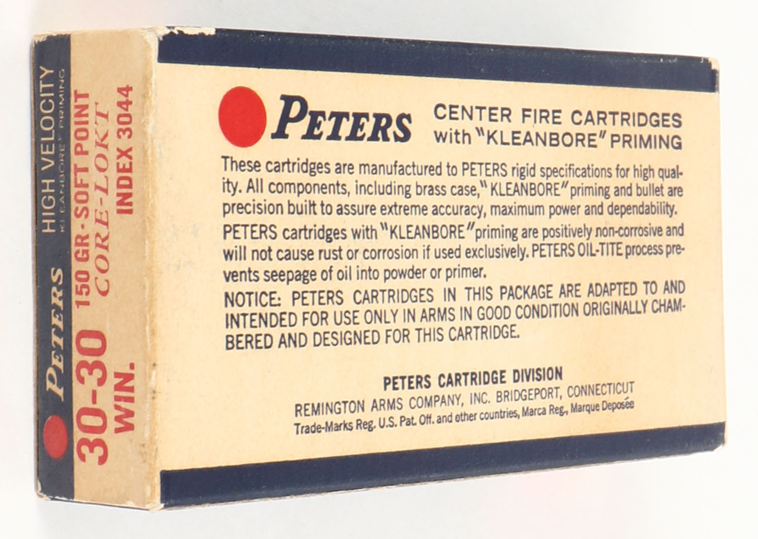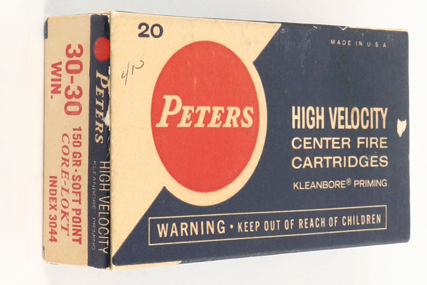 Peters, High Velocity, .30-30 Winchester, 150 Grain Soft Point Core Lokt Bullet, Full (all ammo has correct H/S, 6rds. have brass primers, 14rds. have nickel primers), 1pc. Blue white & red box, box is solid with very good color, some age soiling, top has been written on, corners are mostly sharp, edges are crisp, end flaps are solid, ammo is excellent. Grade: Excellent - Value: 16 to 60