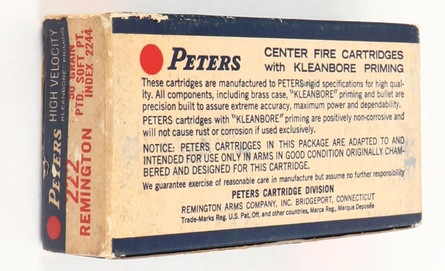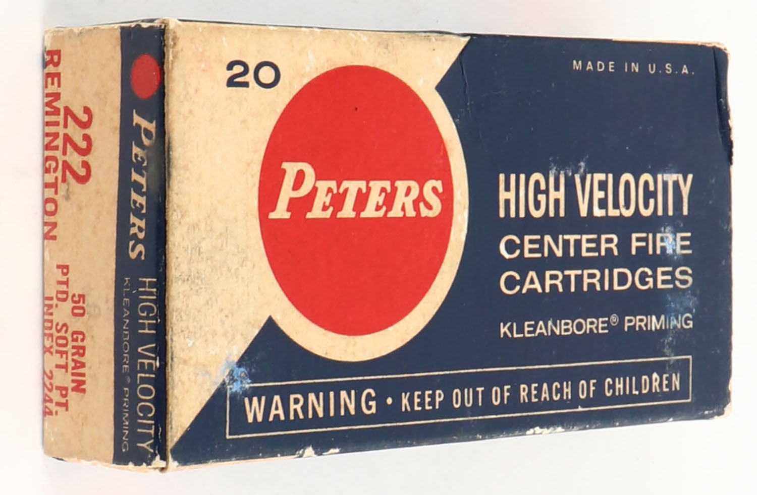 Peters, High Velocity, .222 Remington, 50 Grain Pointed Soft Point, Full, 1pc. Blue white & red box, box is solid with very good color, some age soiling & corner wear, minor edge wear, end flaps are solid, ammo is excellent. Grade: Very Good ++ - Value: 20 to 60
