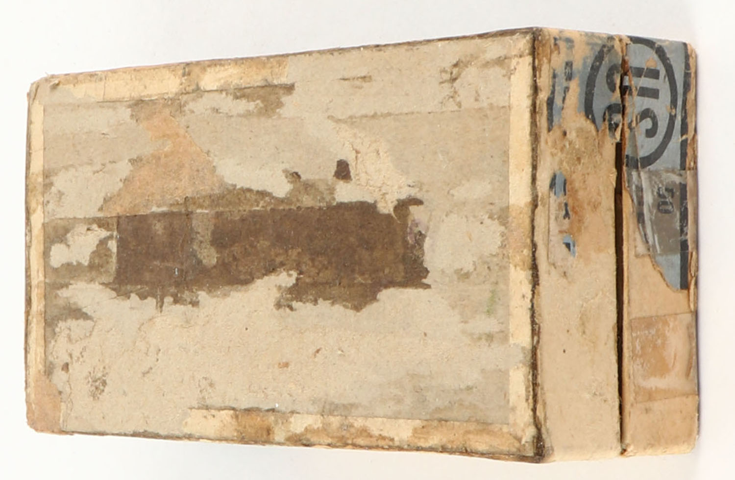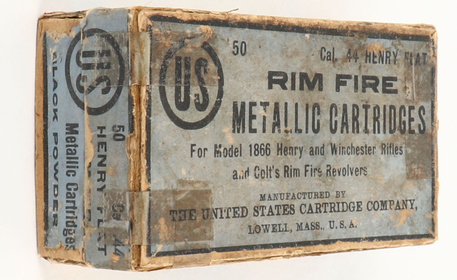 U.S., Metallic Cartridges, .44 Henry Flat, Black Powder, Full, 2pc. Buff box with blue top & side sealing labels, box is solid with good color, some age soiling & shelf wear, tape on all corners of lid, all seams on lid have been split and repaired, some edge & corner wear, side sealing label is 70% intact, ammo is good. Grade: Good - Value: 400 to 1200