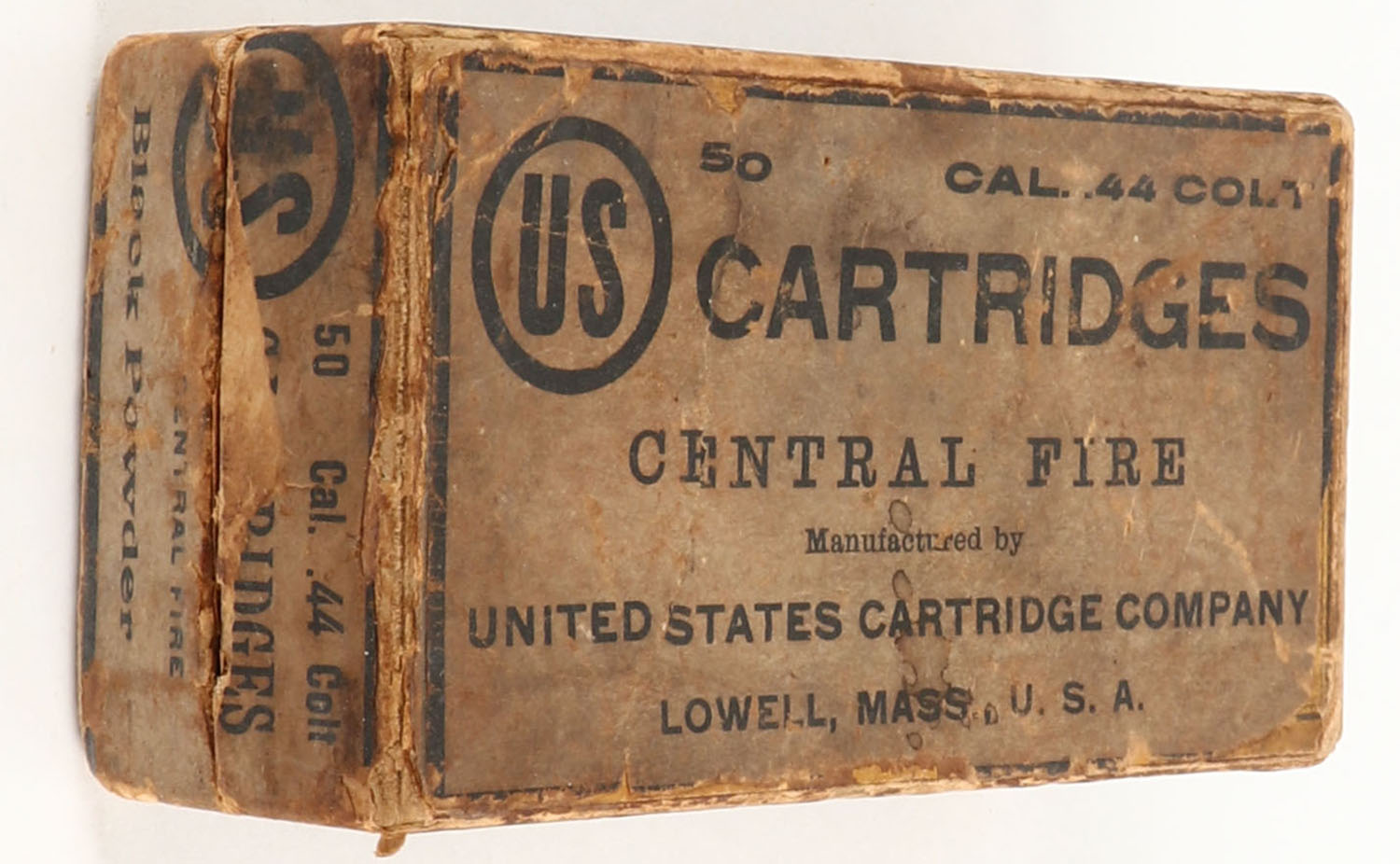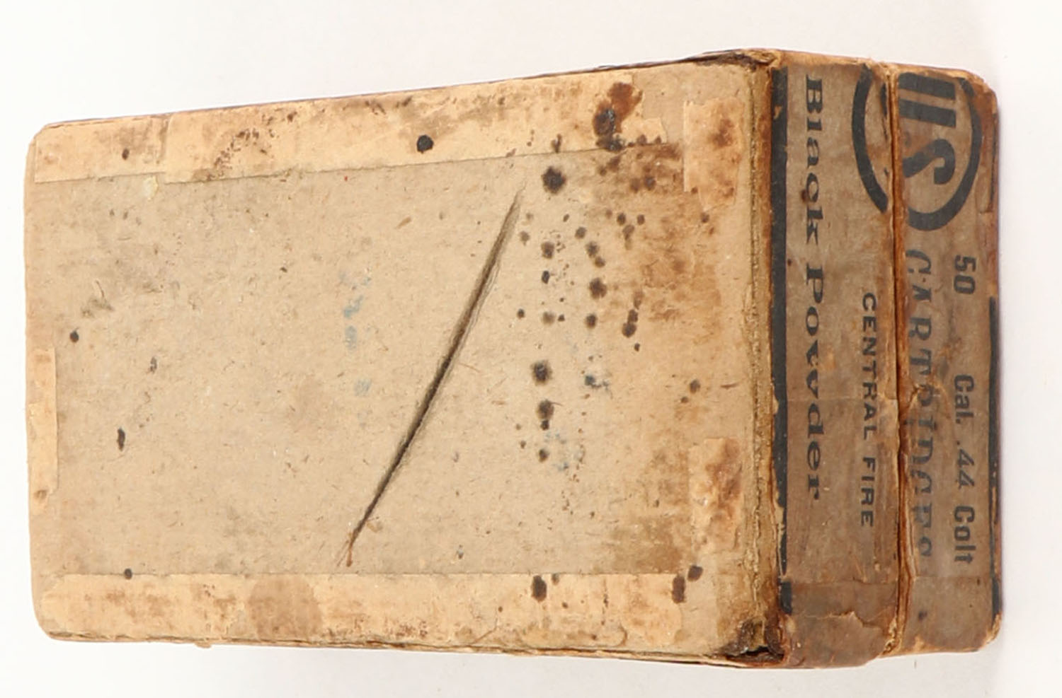 U.S., Central Fire Cartridges, .44 Colt, Black Powder, Full, 2pc. Buff box with blue top & side sealing labels, box is solid with fair color, age soiling, some shelf wear & staining, edge & corner wear, labels are intact, ammo is fair. Grade: Good - Value: 20 to 80