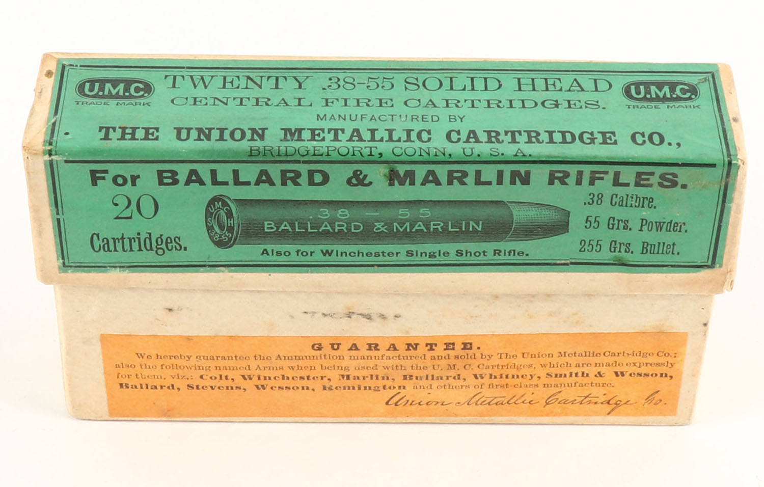 UMC, Central Fire Cartridges, .38-55 Ballard & Marlin, 255 Grain Bullet, Full, 2pc. Buff box with green label, box is solid with excellent to minty color, minor shelf wear, very minor corner wear, edges are crisp, label is intact, ammo is excellent. Grade: Excellent ++ - Value: 50 to 150