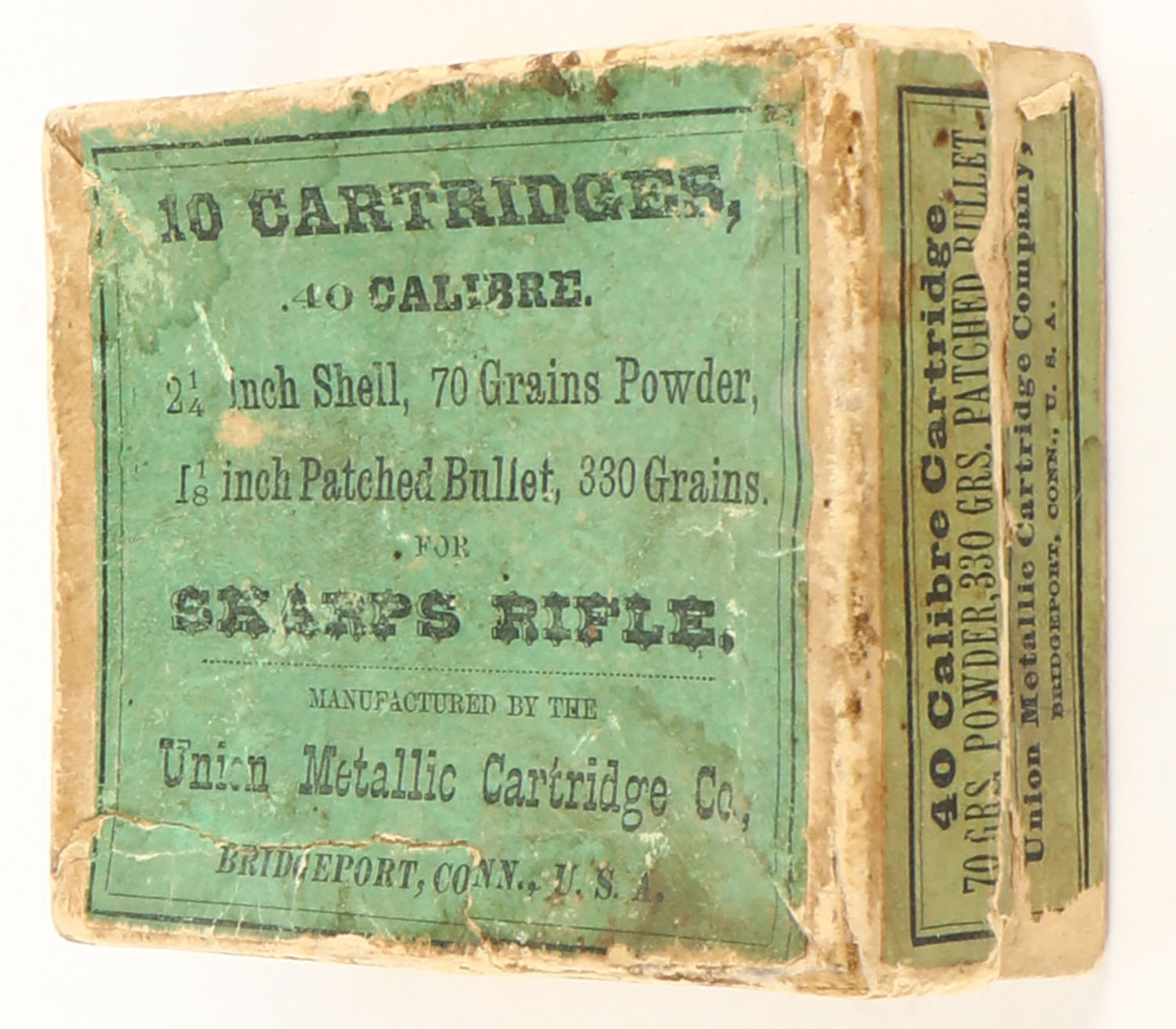 UMC, Sharps Rifle Cartridges, .40 Calibre, 2 1/4 inch Shell, 70 Grains Powder, 1 1/8 inch Patched Bullet, 330 Grains, Full, 2pc. Buff box with green labels, box is solid with very good color, some age soiling, shelf wear, edge & corner wear, labels are intact, ammo is excellent. Grade: Very Good + - Value: 100 to 400