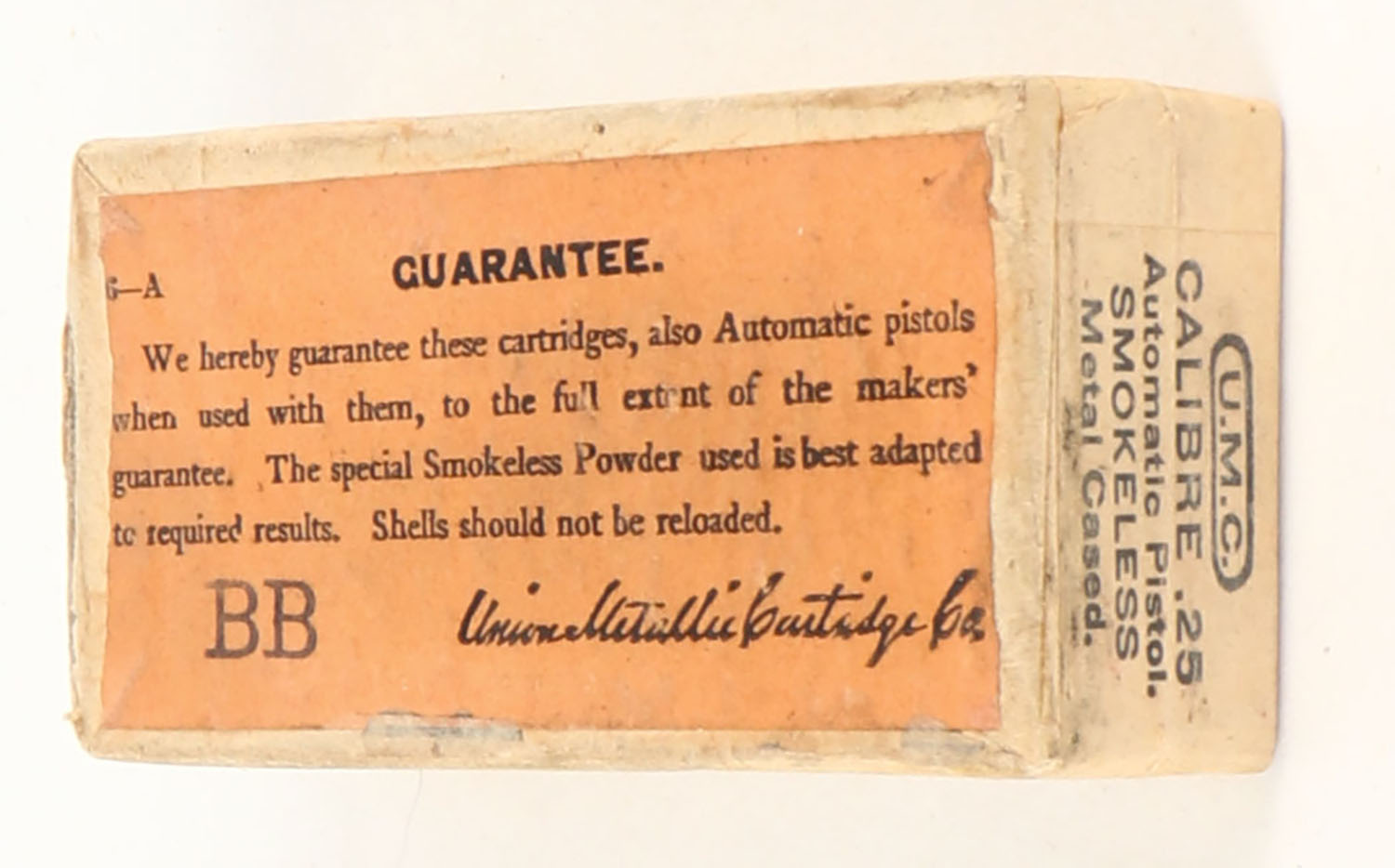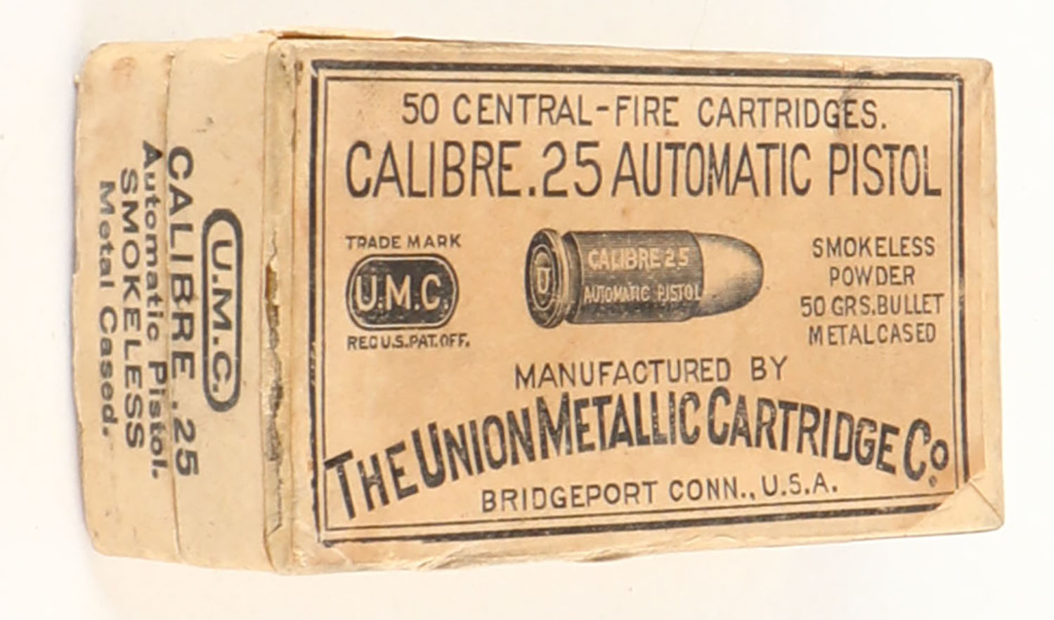 UMC, Central-Fire Cartridges, .25 Automatic Pistol, 50 Grain Metal Cased Bullet, Partial 48rds., 2pc. Buff box with buff top & side sealing labels, box is solid with excellent color, minor edge & corner wear, labels are intact, ammo is excellent. Grade: Excellent + - Value: 16 to 60