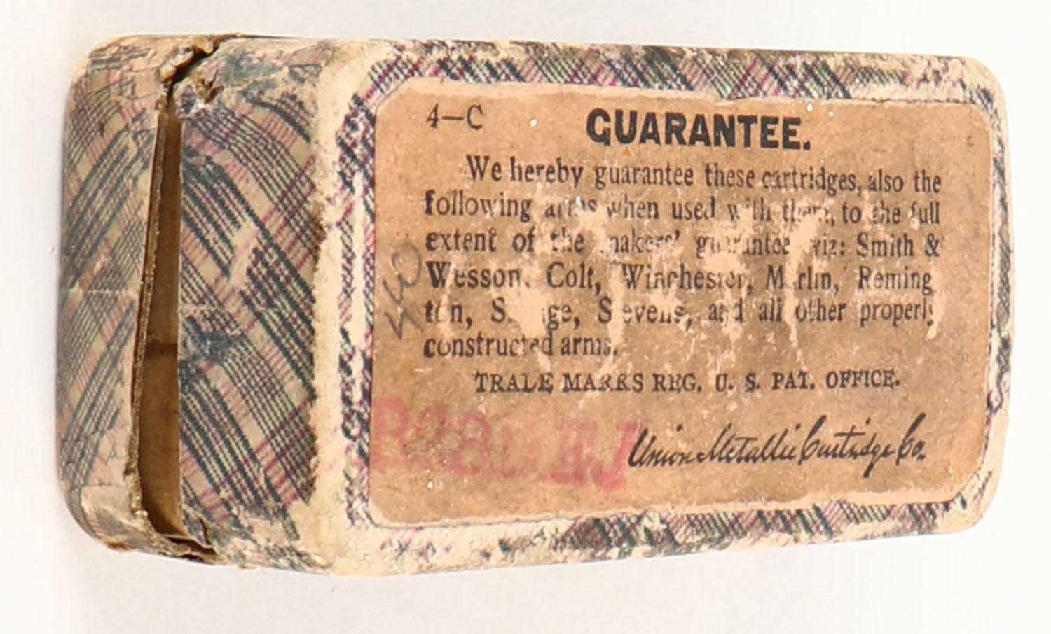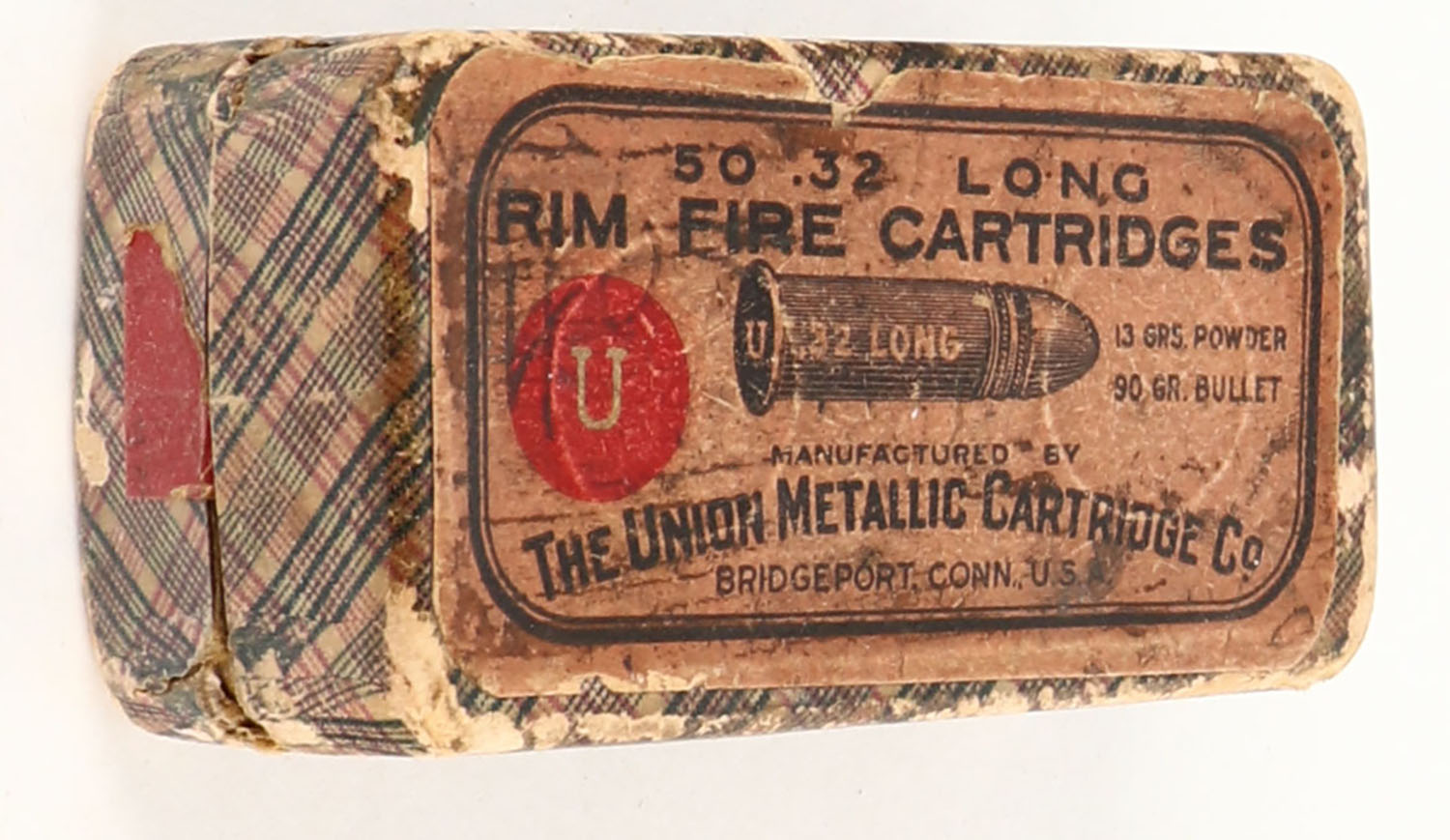 UMC, Rim-Fire Cartridges, .32 Long Rim-Fire, 90 Grain Bullet, Partial 34rds. 2pc. Purple fabric box with red top label, side sealing label is missing, good color, age soiling, top has been written on, some shelf wear, edge & corner wear, top label is intact, ammo is good. Grade: Good ++ - Value: 20 to 60