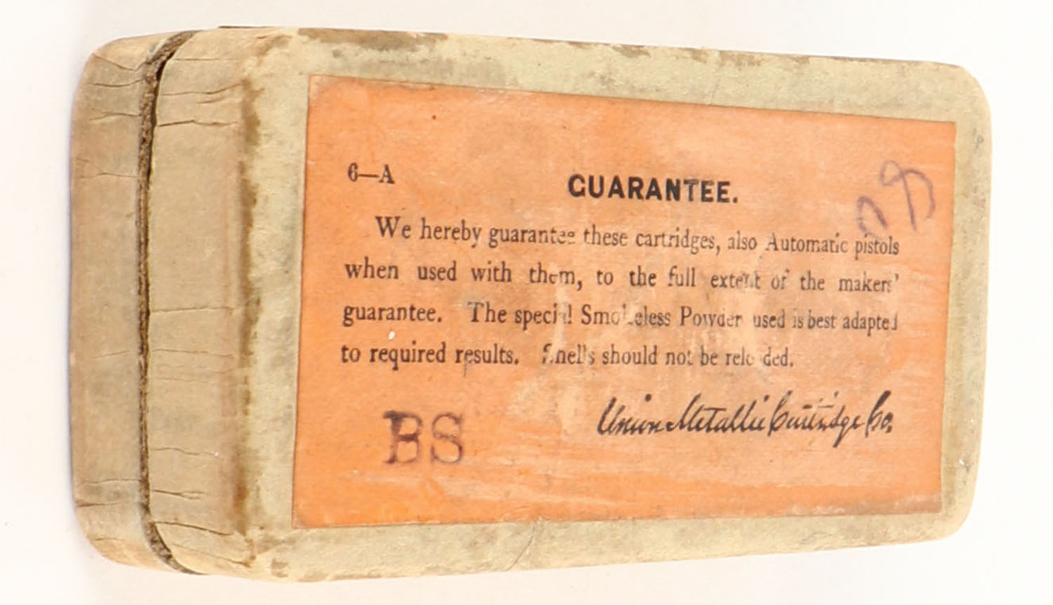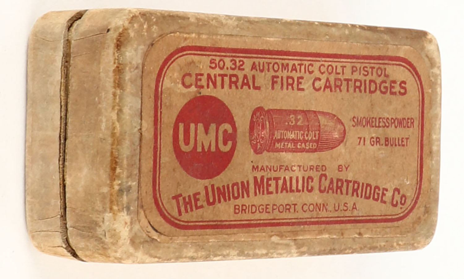 UMC, Central Fire Cartridges, .32 Automatic Colt Pistol, 71 Grain Bullet, Partial 33rds., 2pc. Buff box with buff top label, missing side sealing label, very good to excellent color, minor age soiling, some edge & corner wear, top label is intact, ammo is excellent. Grade: Very Good ++ - Value: 10 to 40