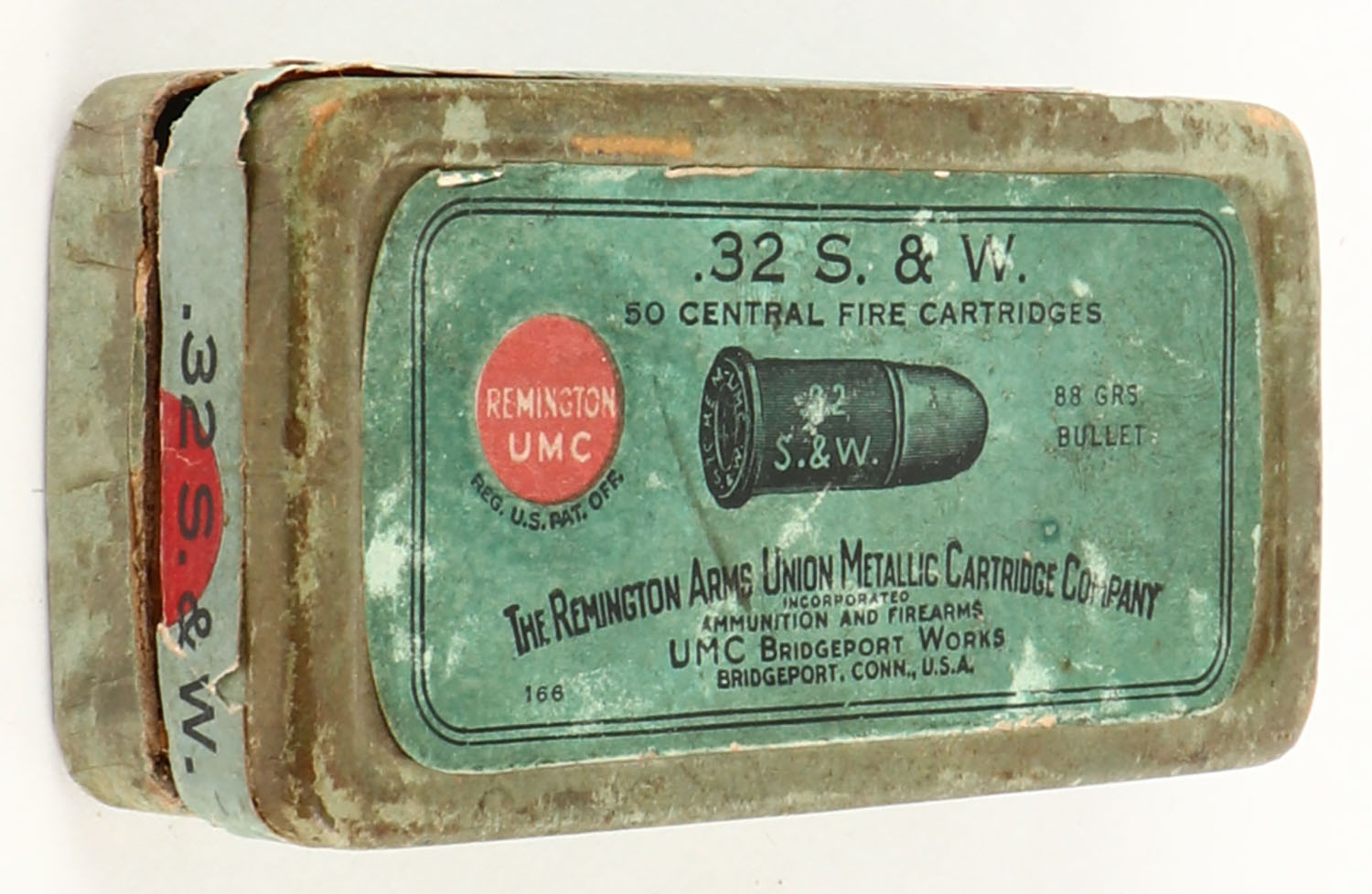 REM-UMC, Central Fire Cartridges, .32 Smith & Wesson, 88 Grain Bullet, Partial 33rds., 2pc. Buff box with blue top & side sealing labels, box is solid with very good color, some age soiling, corners are mostly sharp, edges are crisp, side sealing label is 50% intact, ammo is excellent. Grade: Very Good ++ - Value: 10 to 40
