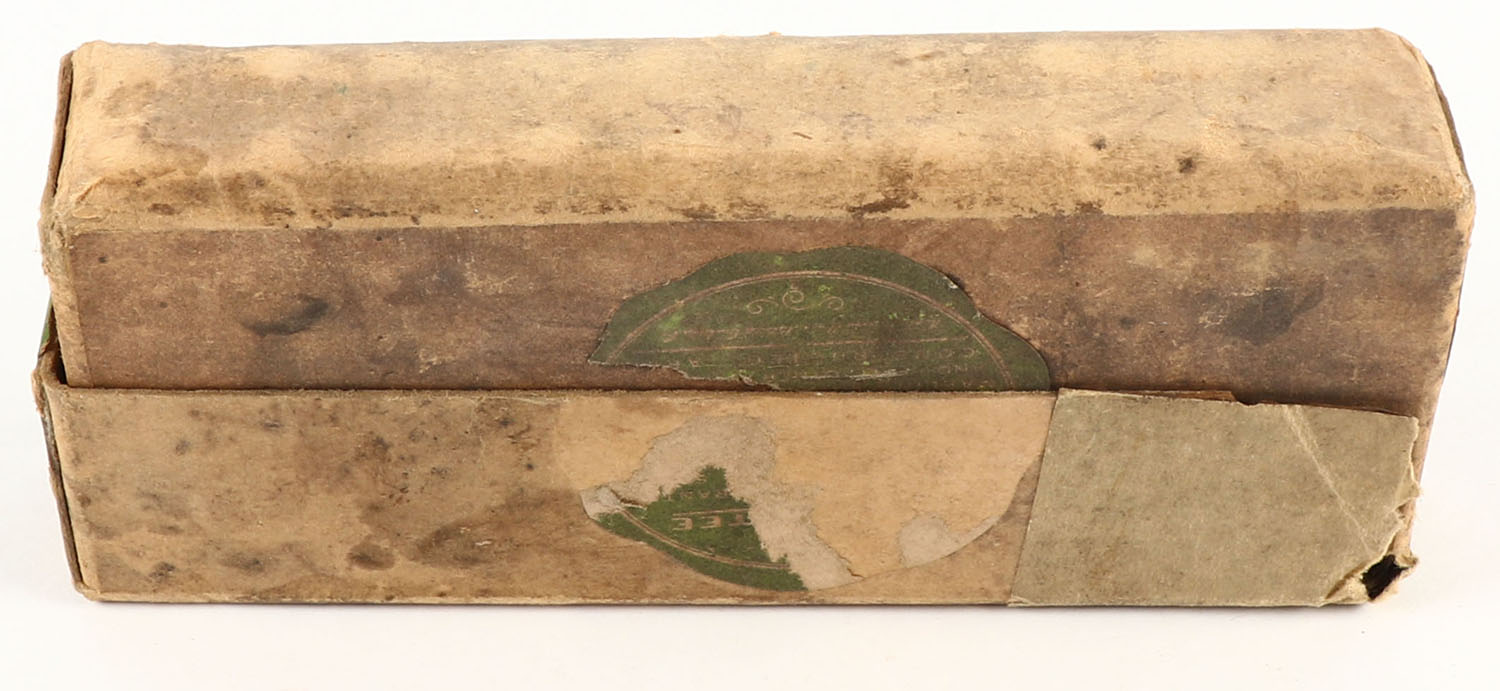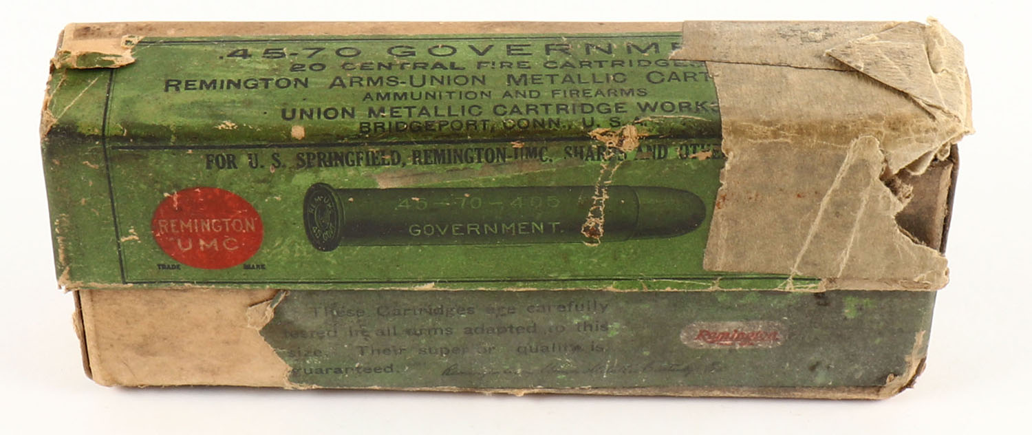 REM-UMC, Central Fire Cartridges, .45-70 Government, 405 Grain Bullet, Full, 2pc. Buff box with green labels, right end of lid is torn off, tape on left end, good color, age soiling, shelf wear, some corner wear, minor edge wear, label is 95% intact, ammo is very good. Grade: Good - Value: 8 to 40