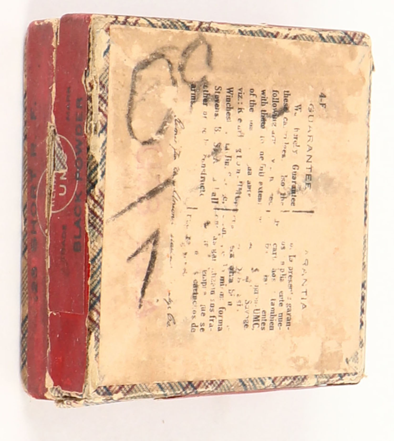 REM-UMC, R.F. Cartridges, .25 Short Rim Fire, Full, 2pc. Purple fabric box with green top & red side sealing labels, box is missing right end of bottom, very good color, some age soiling, minor shelf wear, some edge & corner wear, side sealing label is 80% intact, ammo is good. Grade: Very Good - Value: 40 to 120