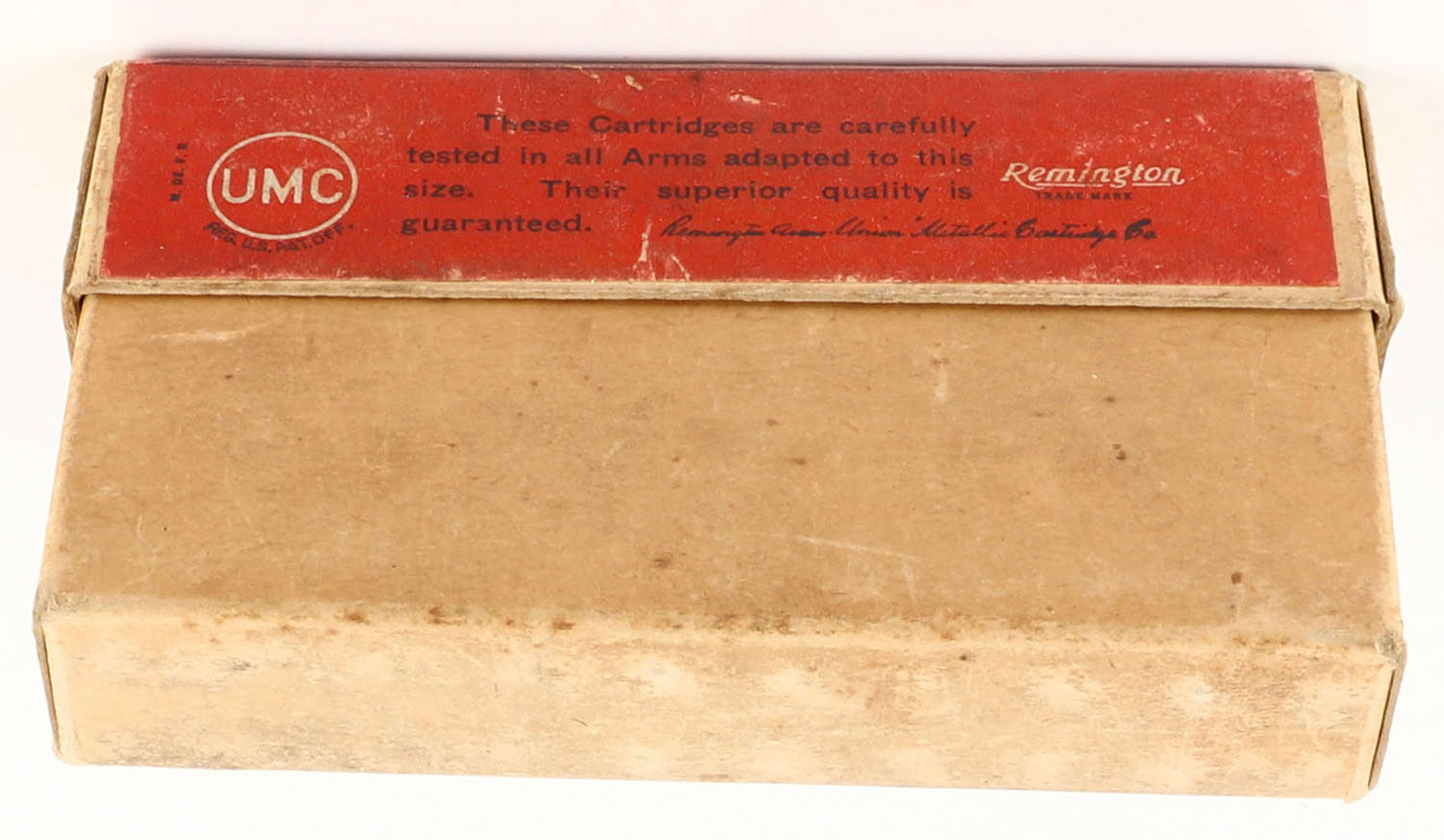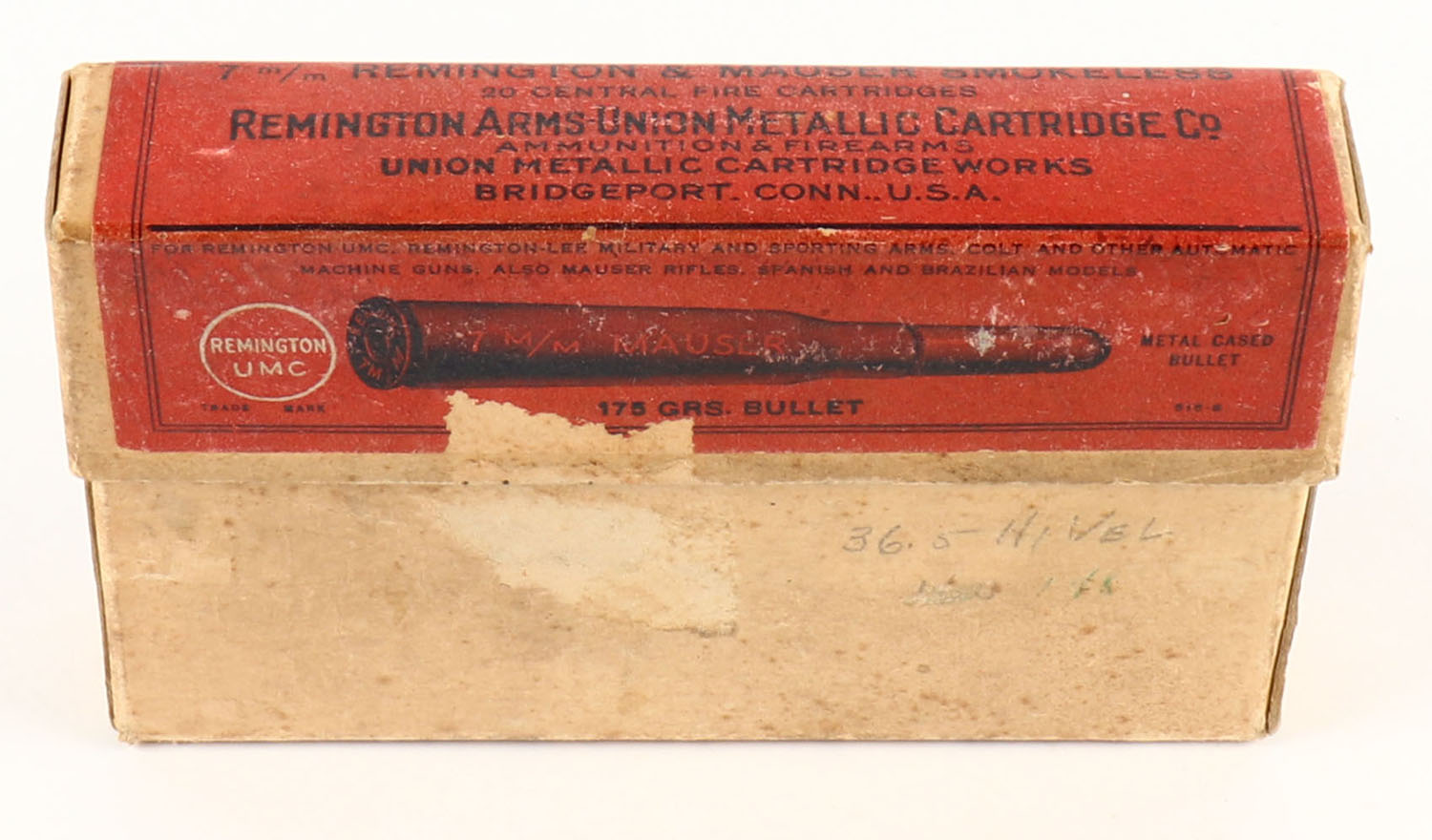 REM-UMC, Central Fire Cartridges, 7mm Mauser, 175 Grain Metal Cased Bullet, Partial 12rds., 2pc. Buff box with red label, box is solid with excellent color, minor shelf wear, scuff on front, front & right end have been written on, very minor edge & corner wear, label is intact, ammo is excellent. Grade: Excellent - Value: 8 to 40