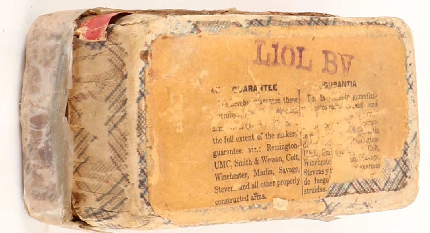 REM-UMC, R.F. Cartridges, .32 Long Rim Fire, 90 Grain Bullet, Partial 41rds. Of mixed H/S (mostly correct), 2pc. Purple fabric box with yellow top & red side sealing labels, box is solid with good color, some age soiling & shelf wear, tape on corners of lid, vertical seam splits of front corners of lid, side sealing label is 50% intact, ammo is very good. Grade: Good - Value: 40 to 120