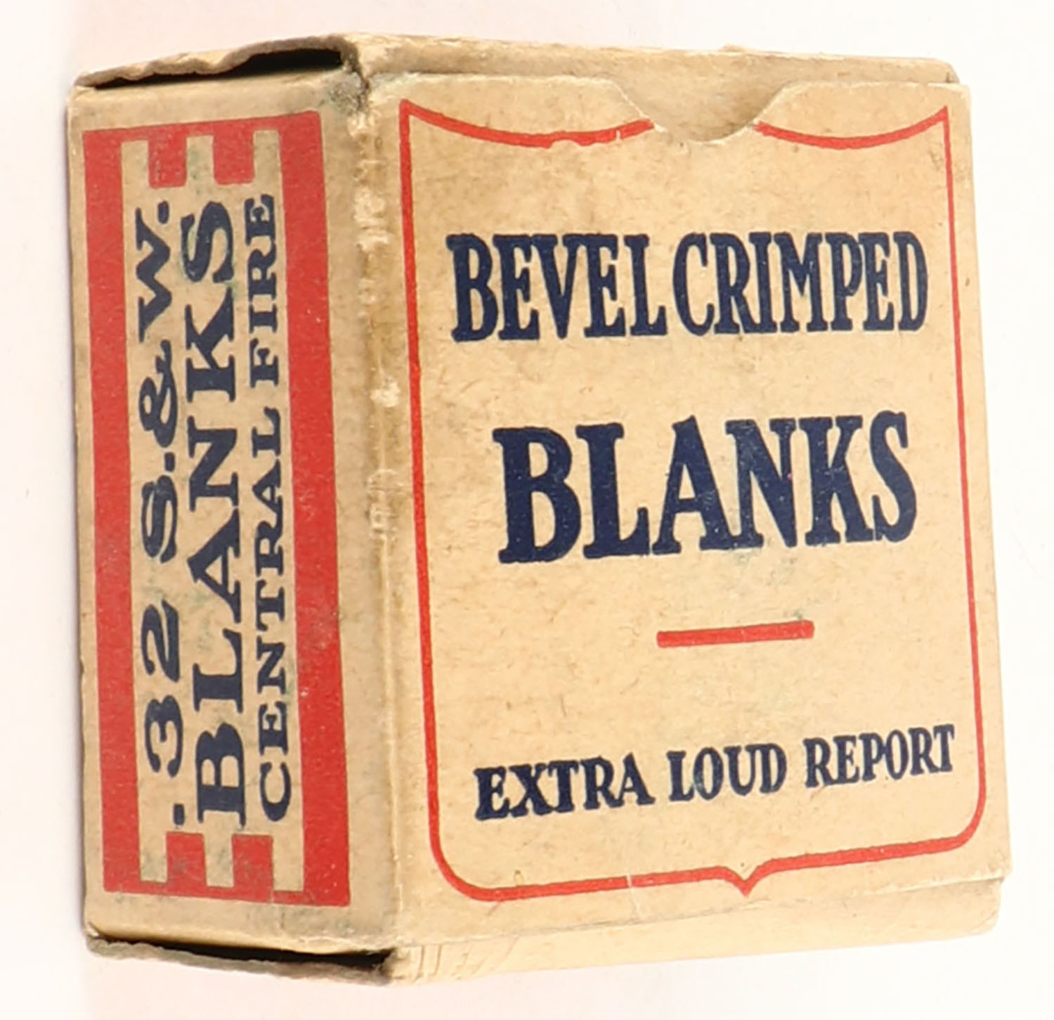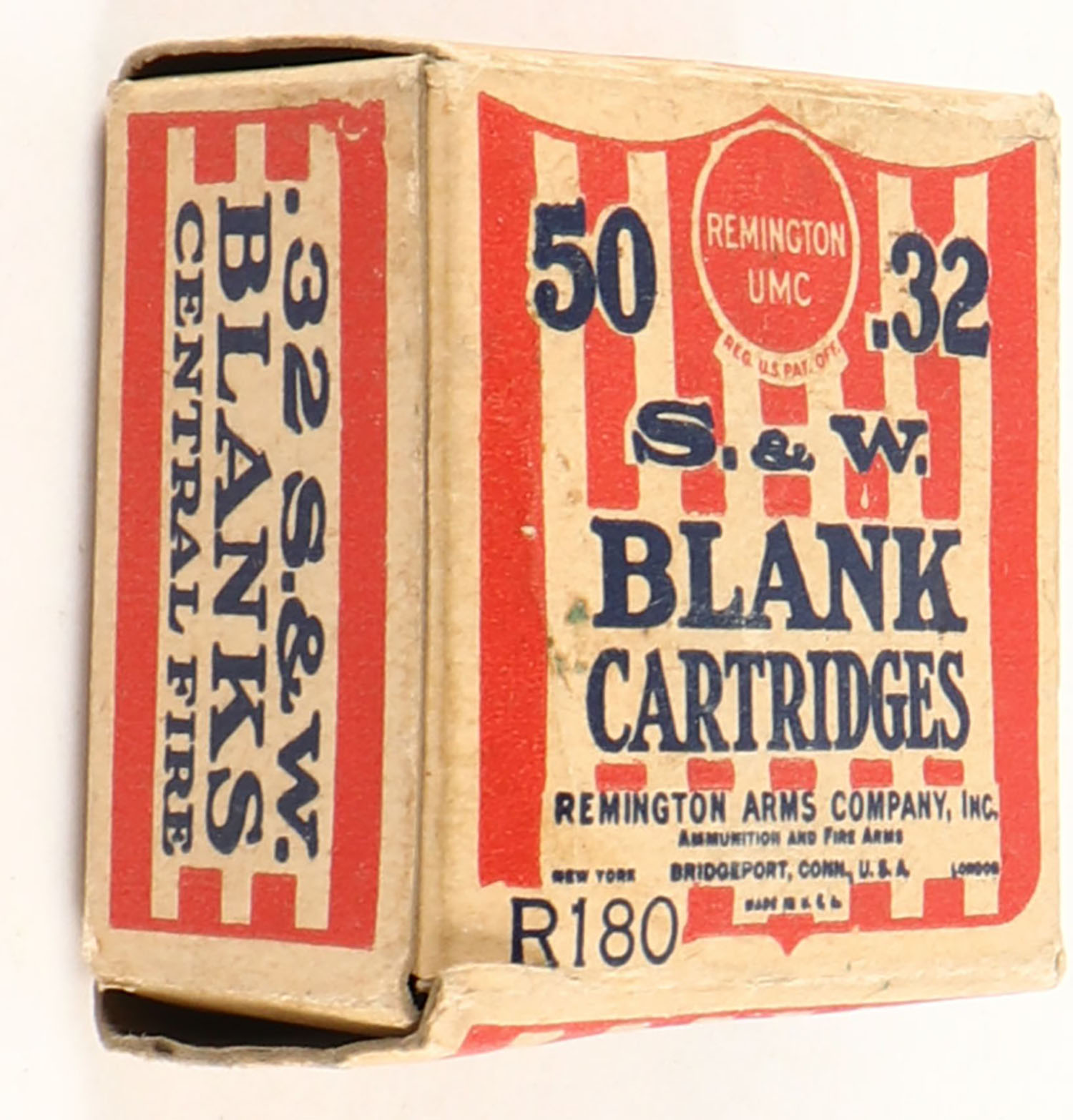 REM-UMC, Blank Cartridges, .32 Smith & Wesson, Full, 1pc. Buff red & black box, box is solid with very good to excellent color, minor age soiling, very minor edge & corner wear, end flaps are solid, ammo is very good to excellent color. Grade: - Value: 10 to 40